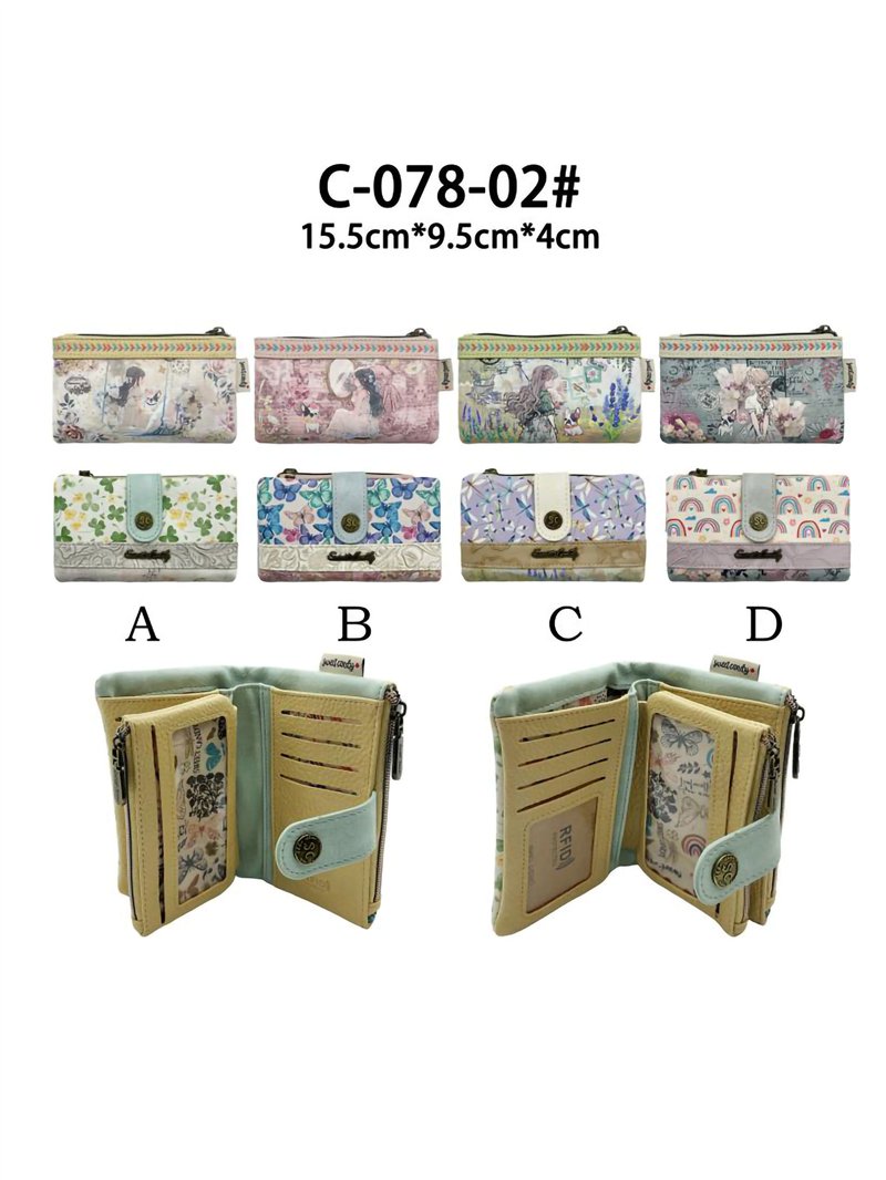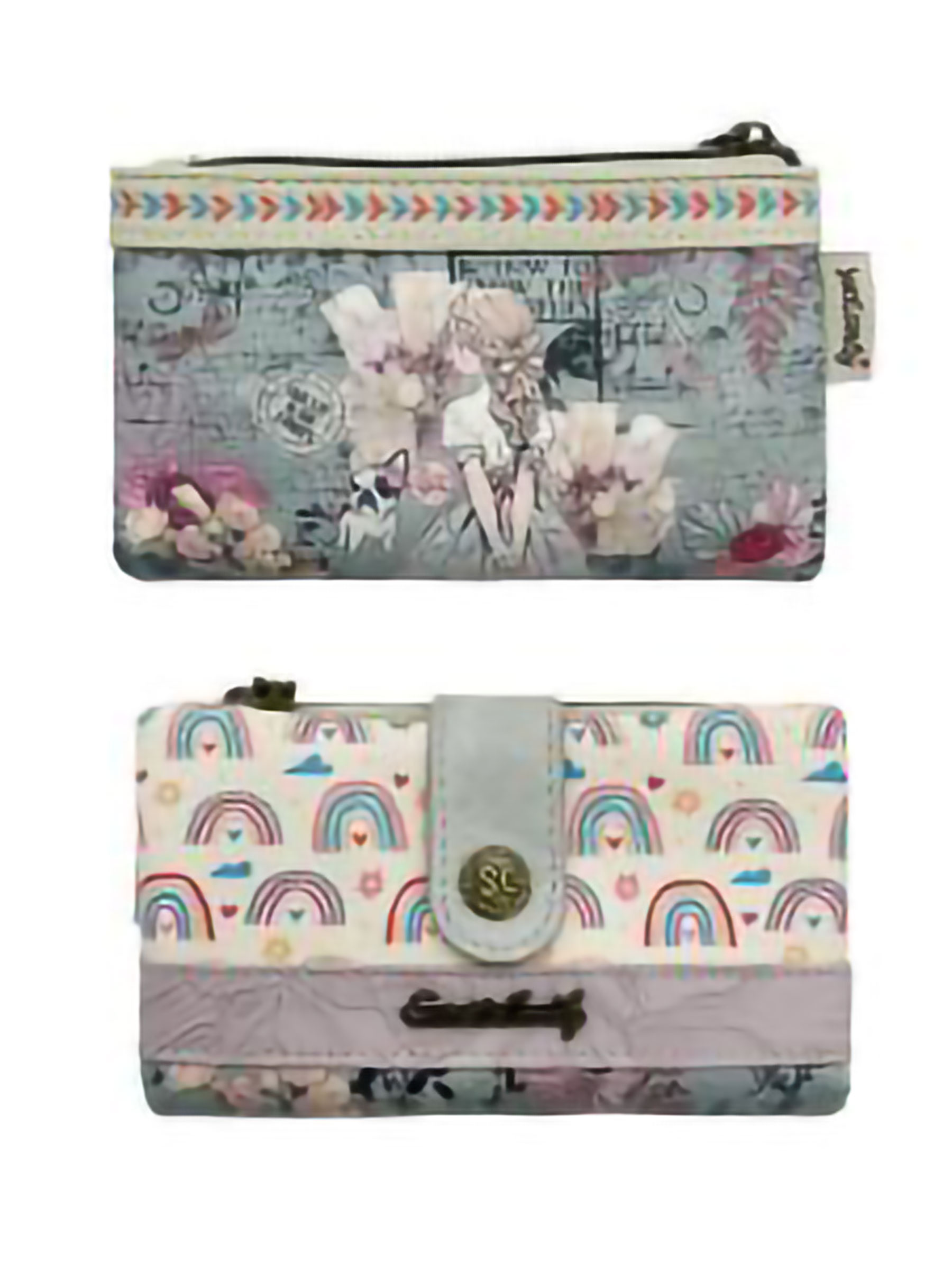Cartera estampada con tarjetero. Material polipiel. Cierre mediante cremallera metálica.