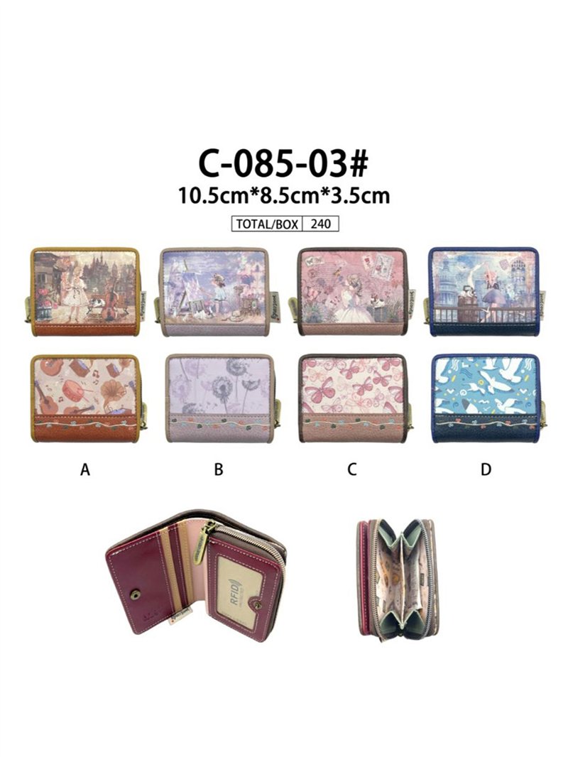 Monedero estampado con tarjetero. Material polipiel. Cierre mediante cremallera metálica.