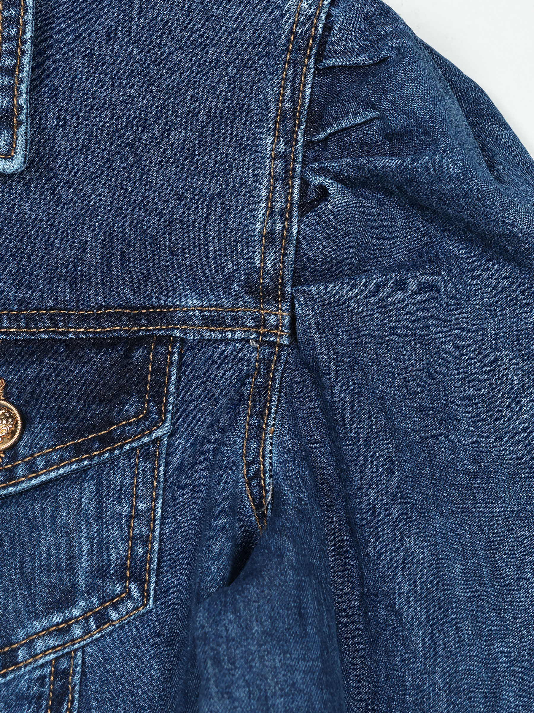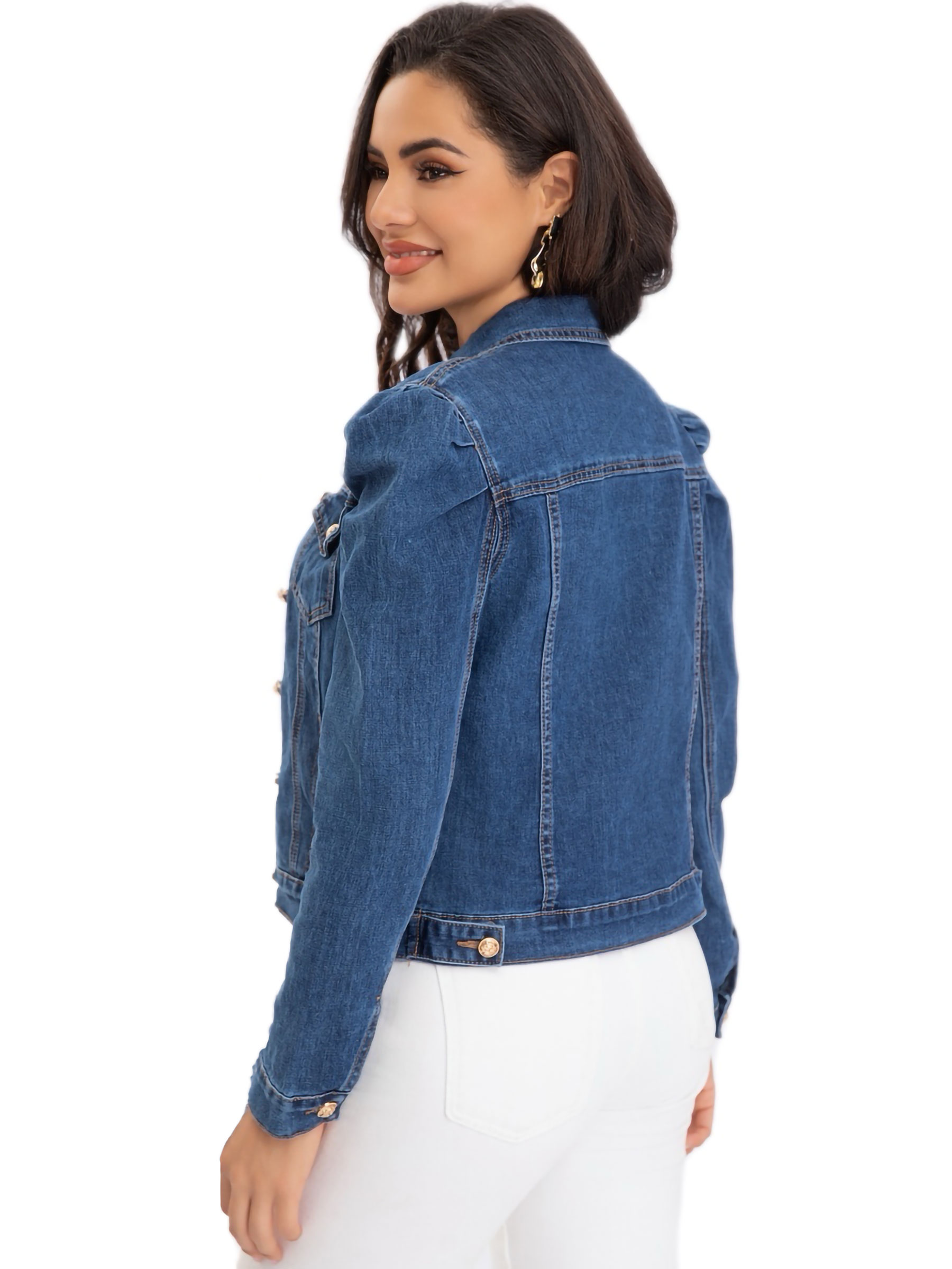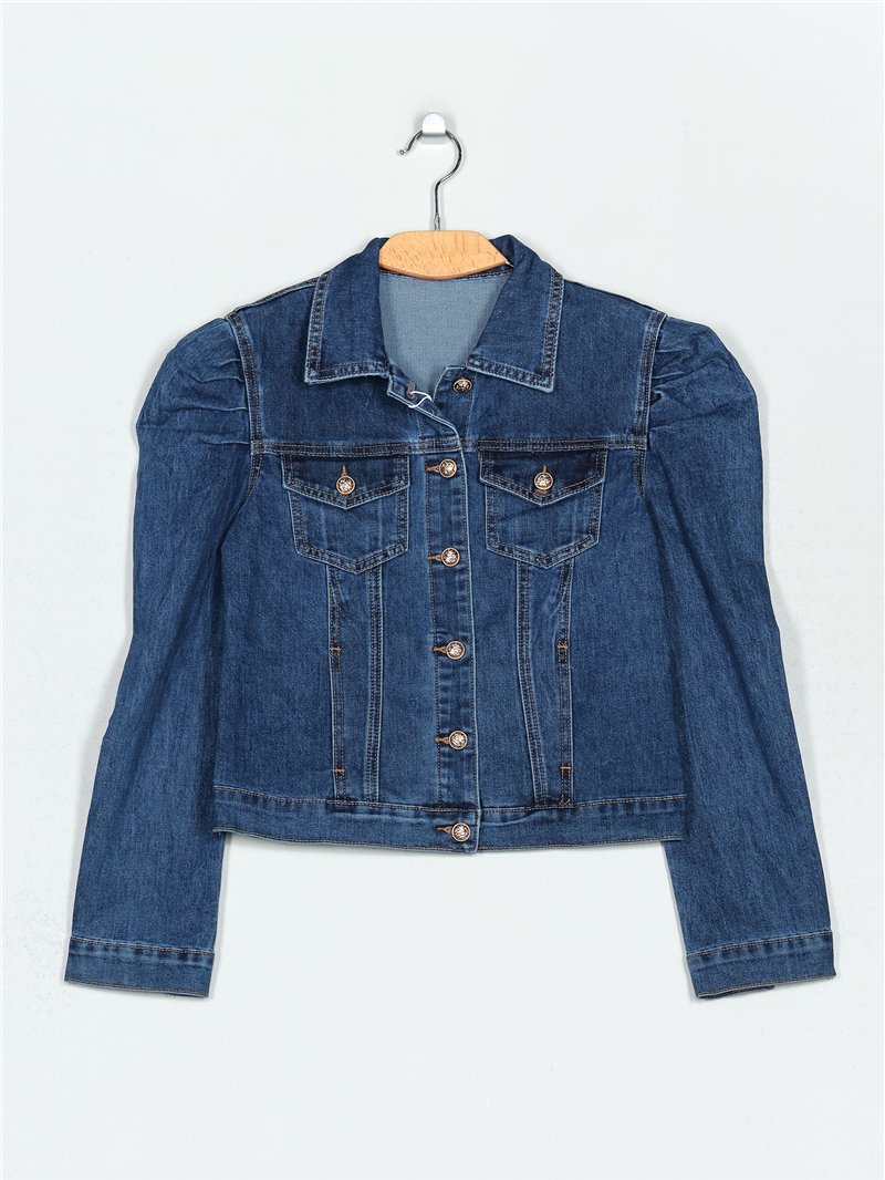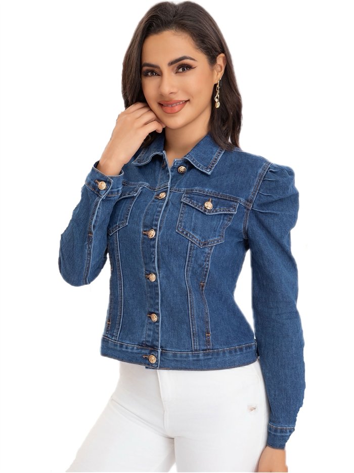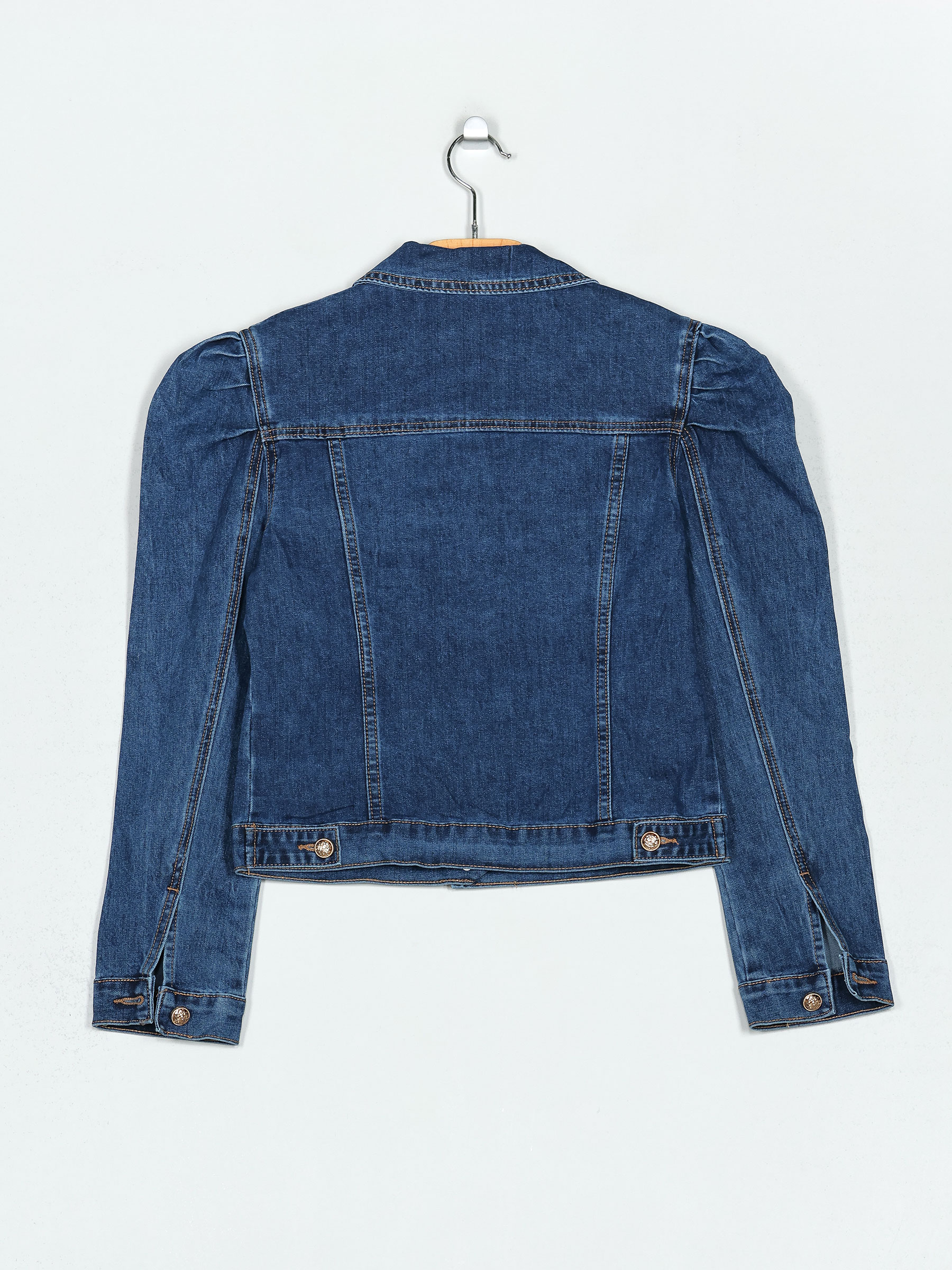 Cazadora denim. Dos bolsillos de parche con solapa en el pecho. Dos bolsillos laterales. Cuello solapa. Manga larga abullonada. Cierre frontal con botones metálicos.