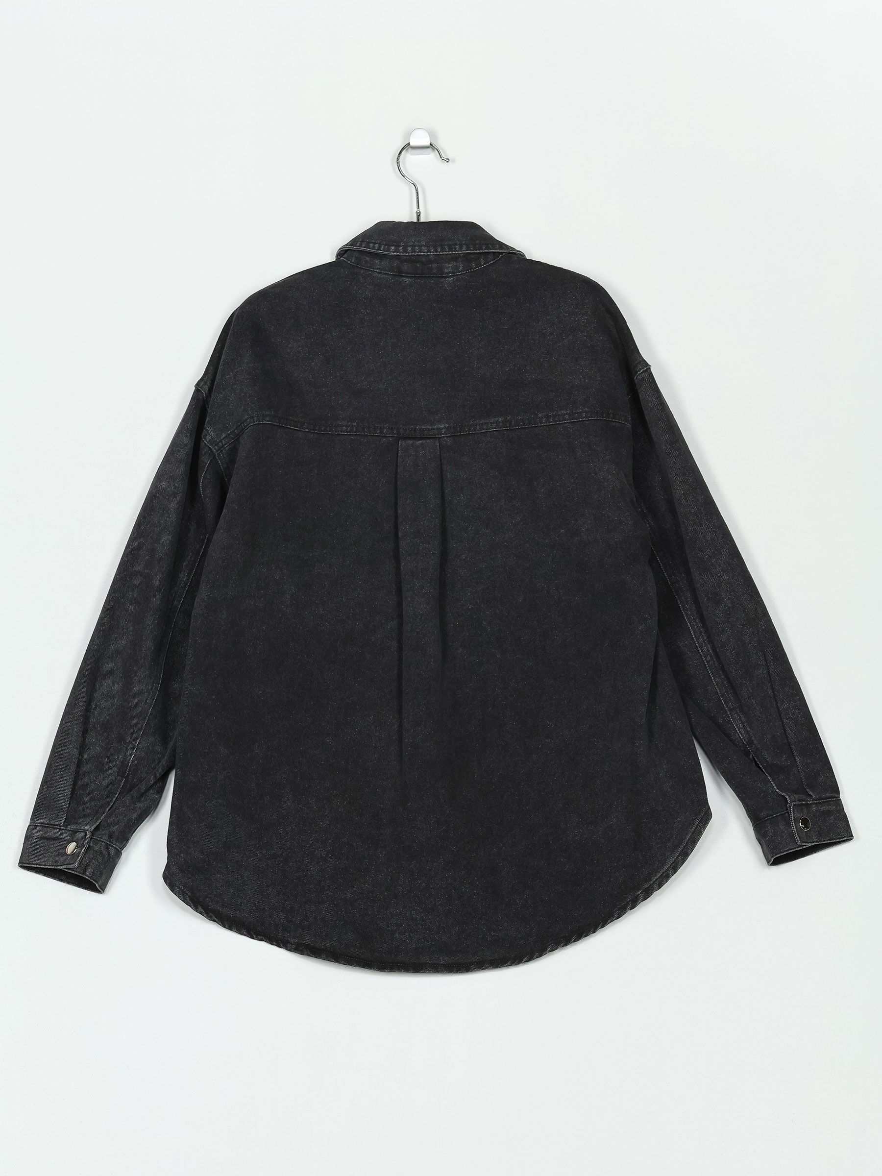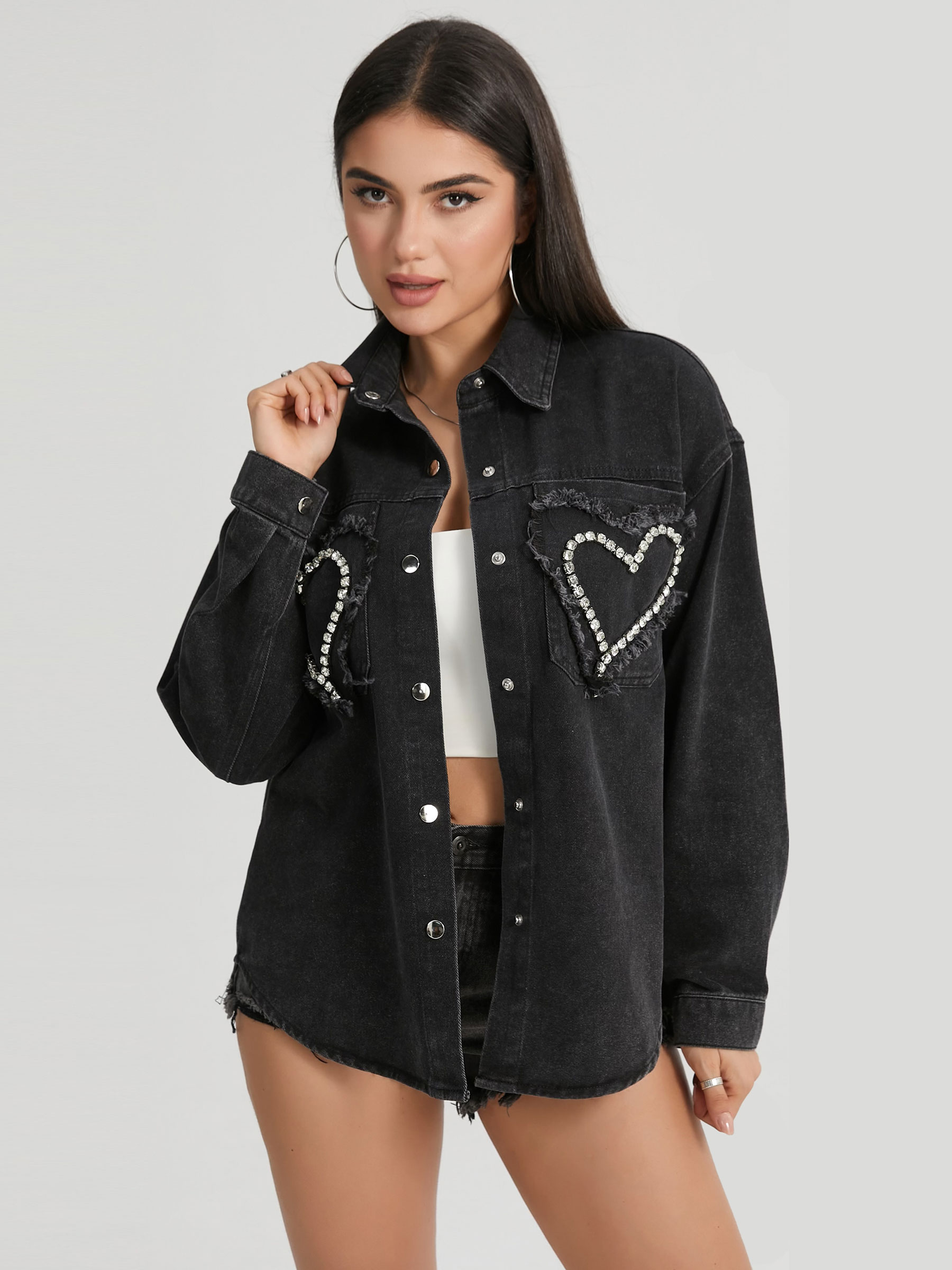 Sobrecamisa vaquera. Detalle corazones con pedrería. Bolsillo de plastrón en el pecho. Acabados desflecados. Tejido no elástico. Cuello solapa. Manga larga. Cierre con botones de presión.