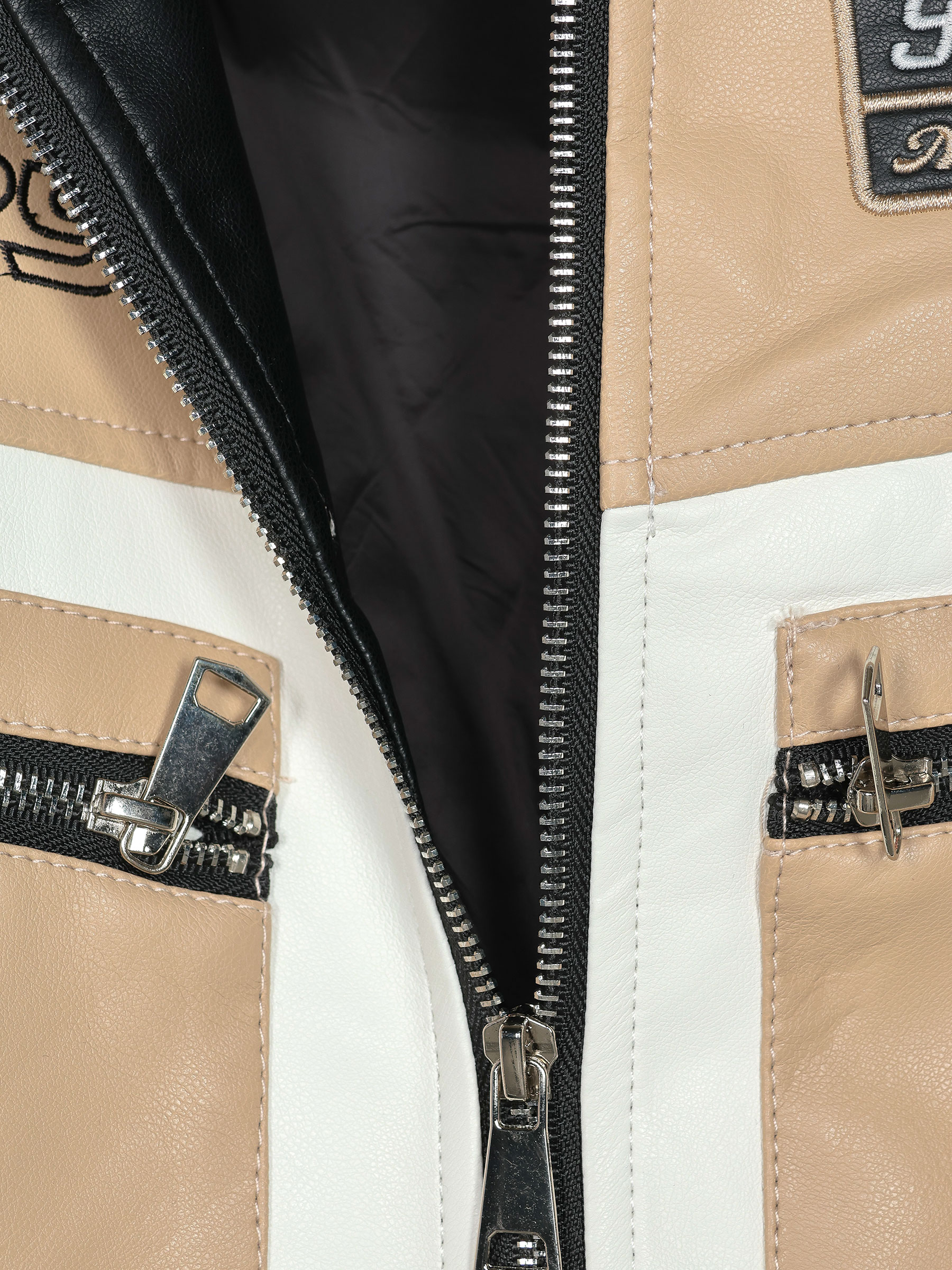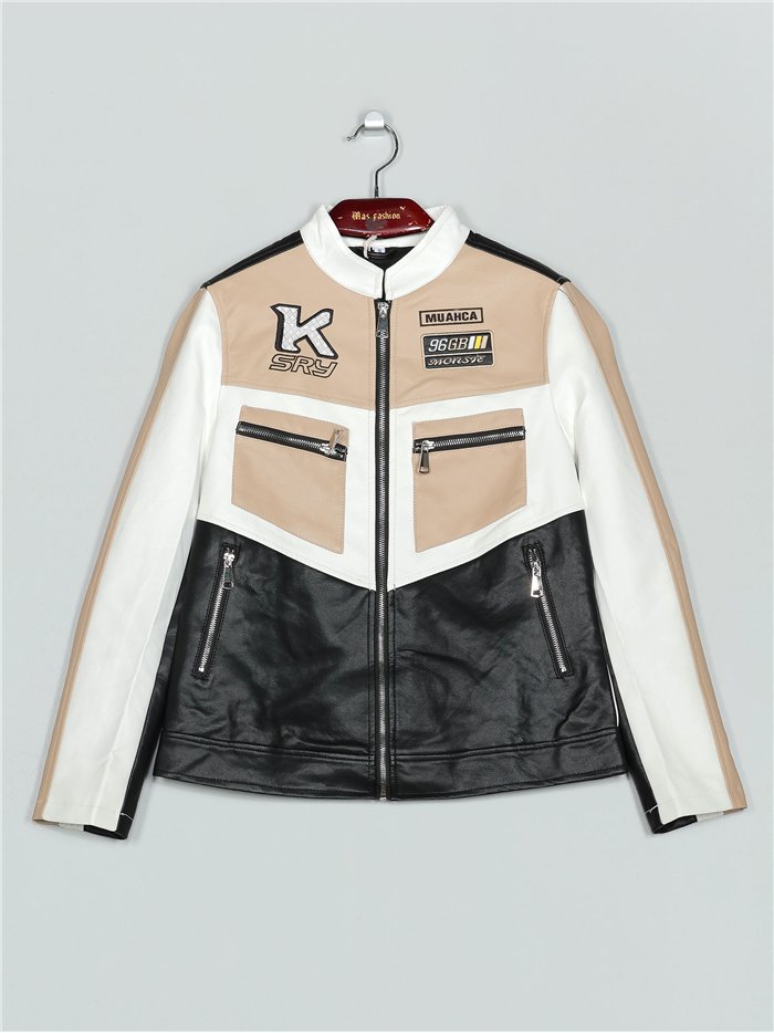 Chaqueta efecto piel. Detalle texto bordado. Bolsillos laterales con cremallera. Cuello subido. Manga larga. Cierre frontal con cremallera metálica.