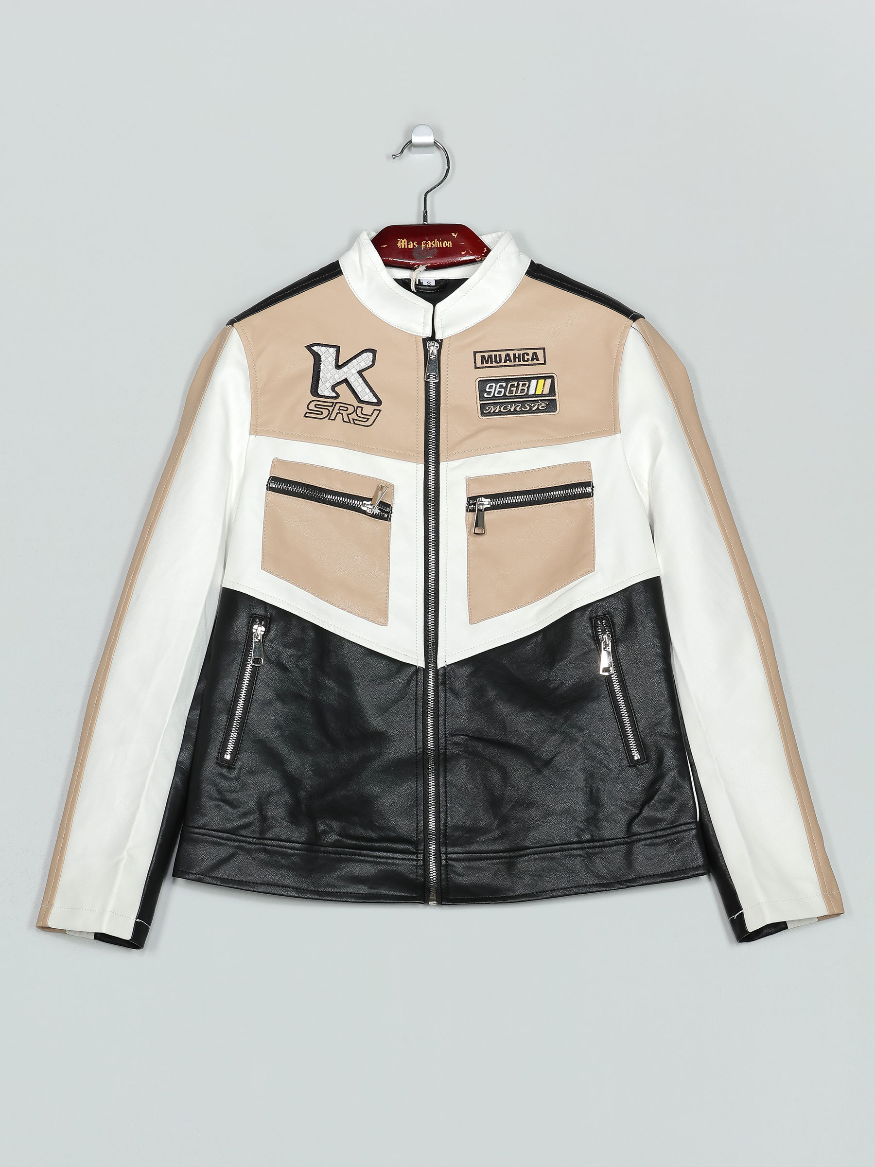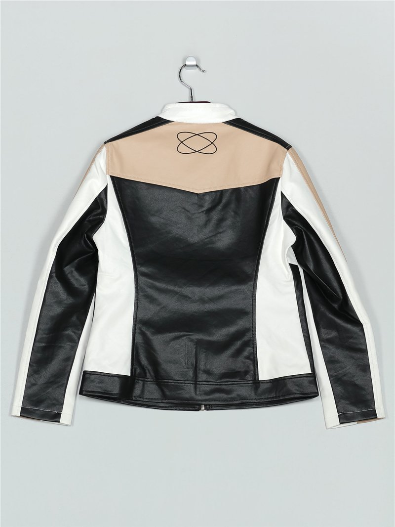 Detalles de chaqueta racing efecto piel MF-MF6701-1-BLACK-WHITE-BEIGE
