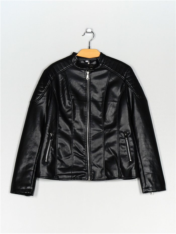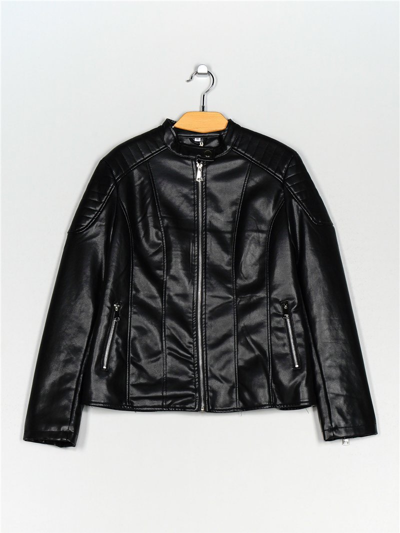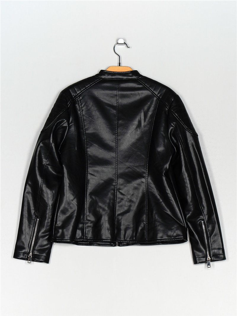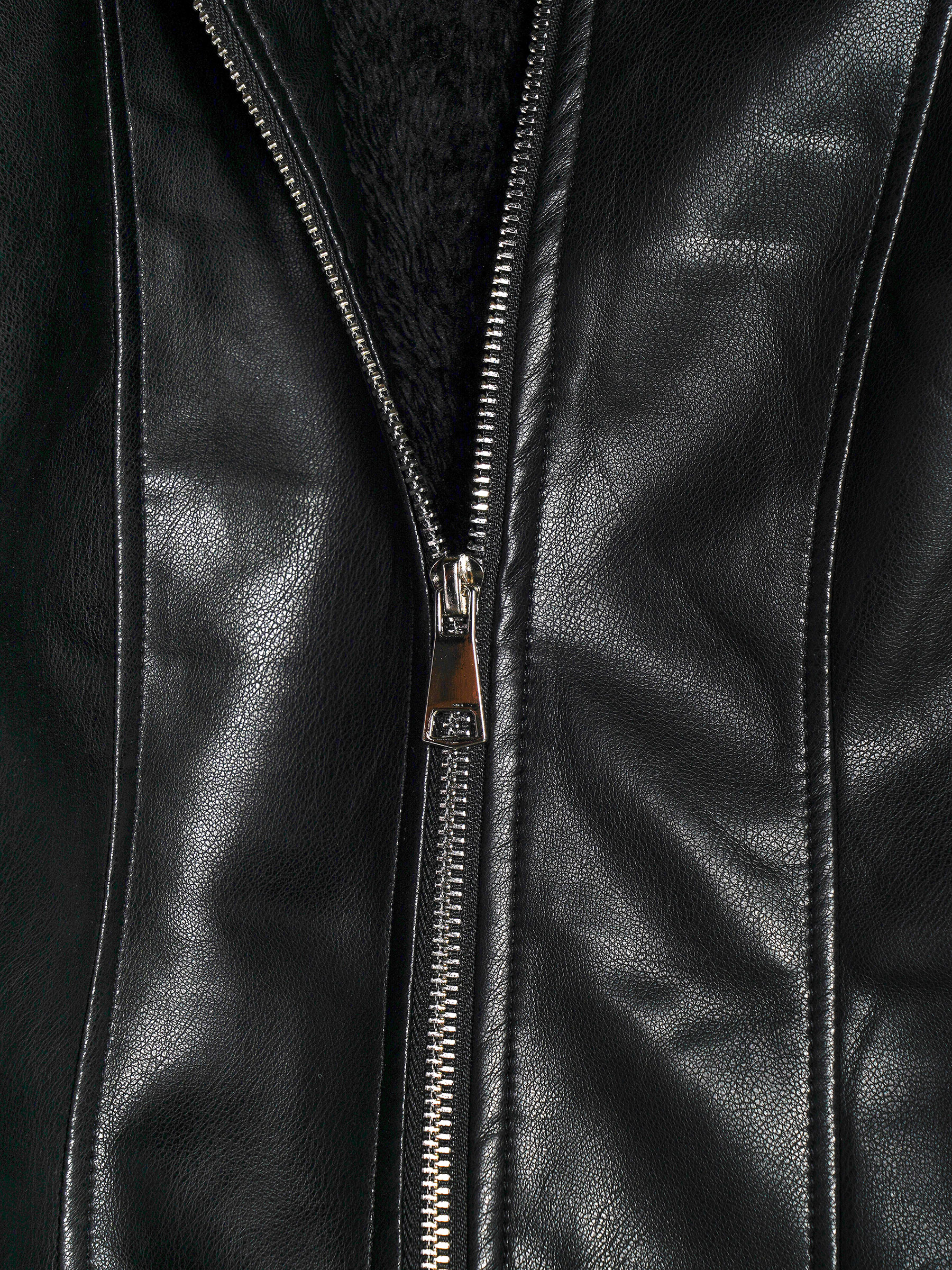 Chaqueta efecto piel. Acabado interior efecto pelo combinado a tono. Cuello subido con botón de presión. Manga larga. Cierre con cremallera metálica.