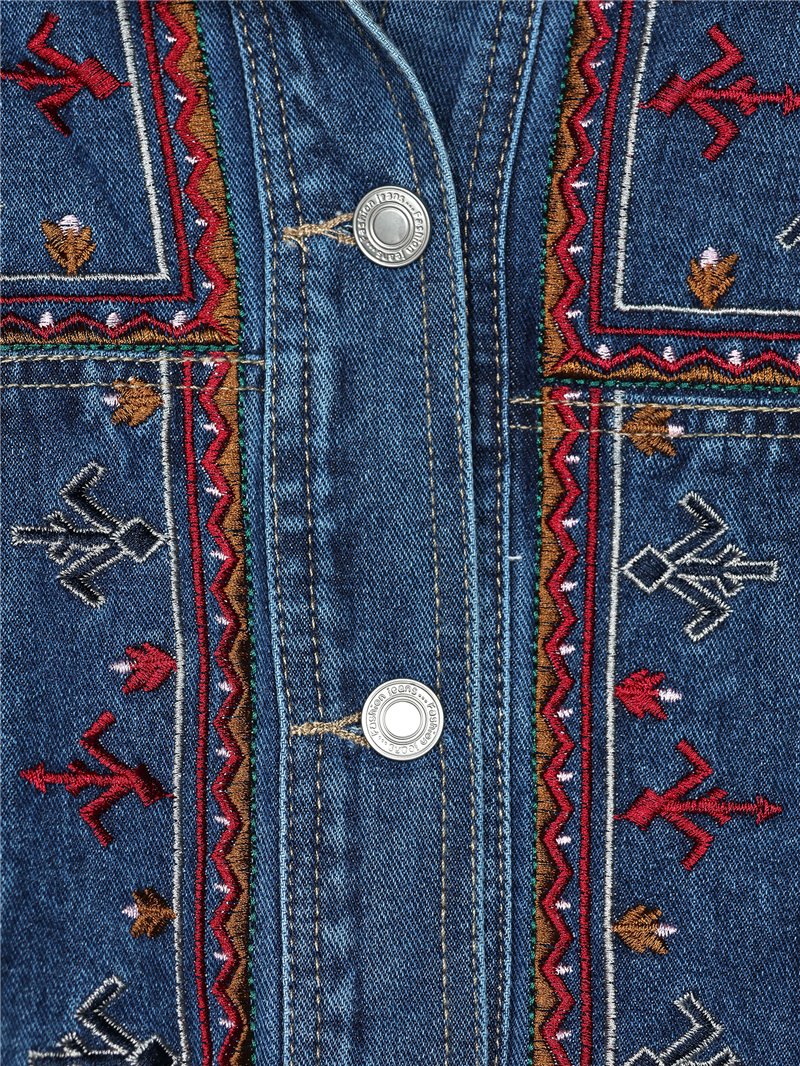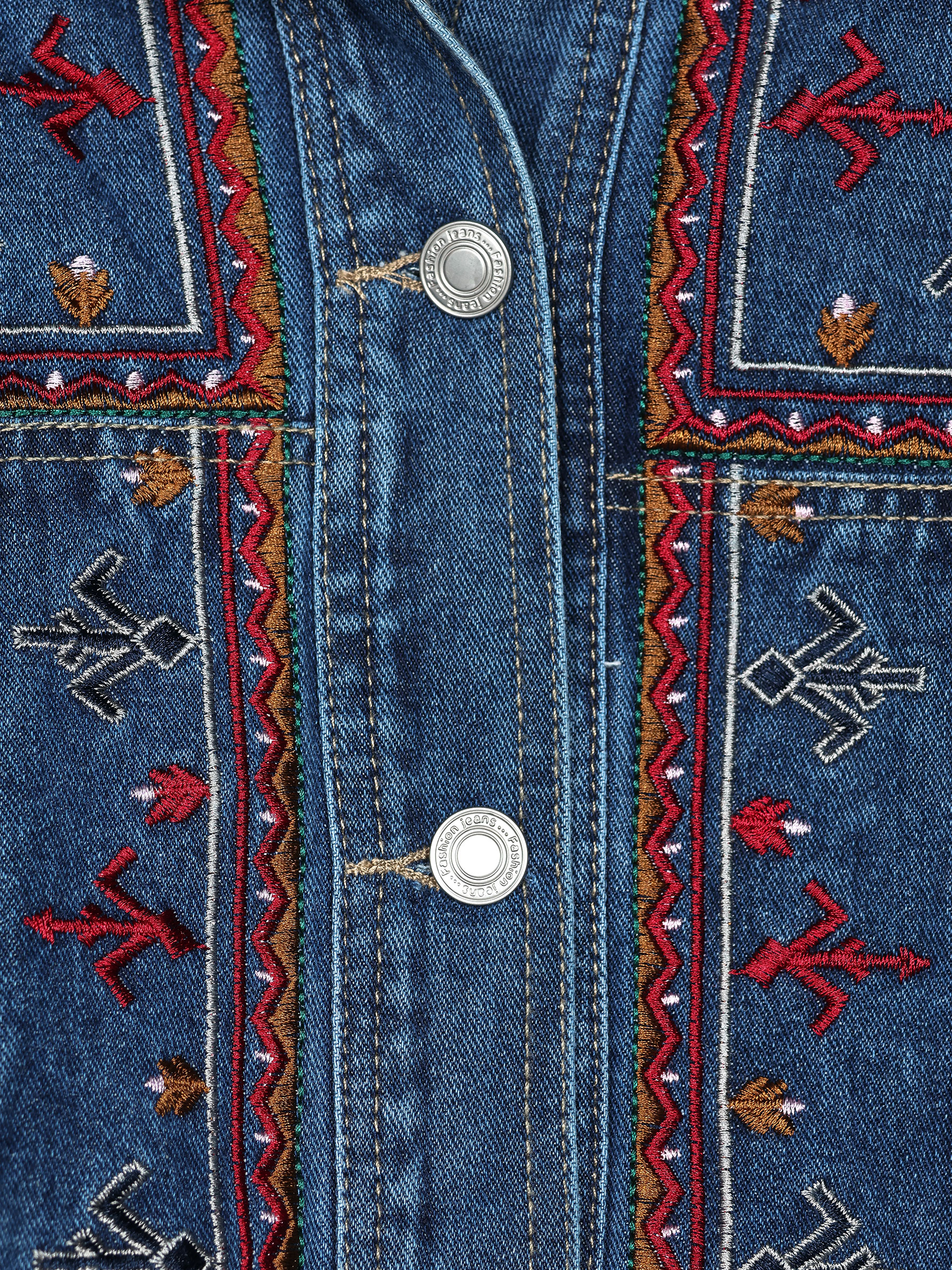 Sobrecamisa amplia vaquera bordada. Tejido no elástico. Dos bolsillos de parche en el pecho. Cuello solapa. Manga larga. Cierre frontal con botones metálicos.