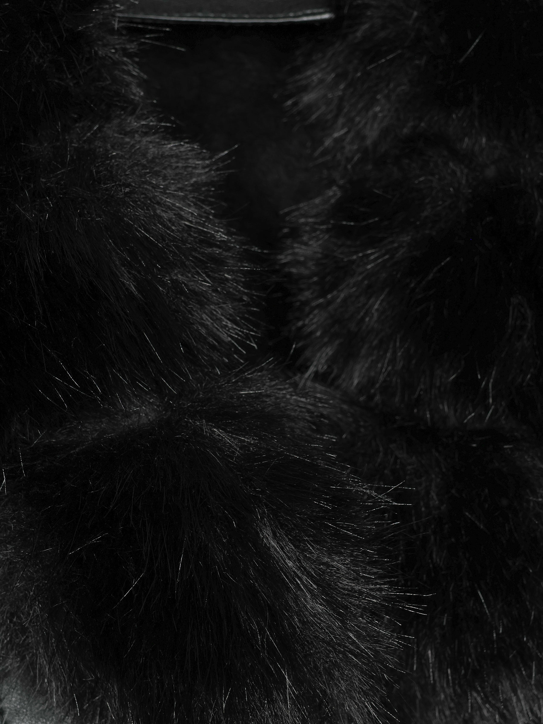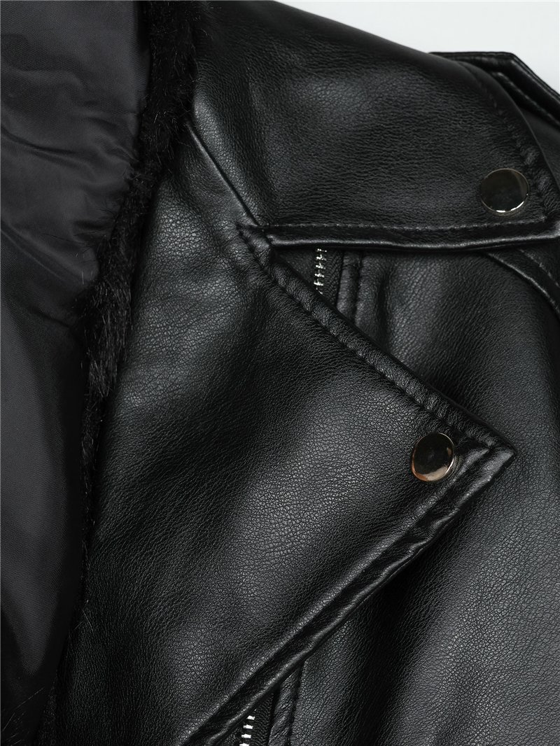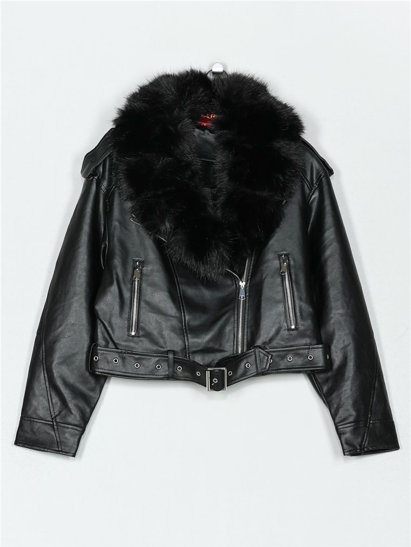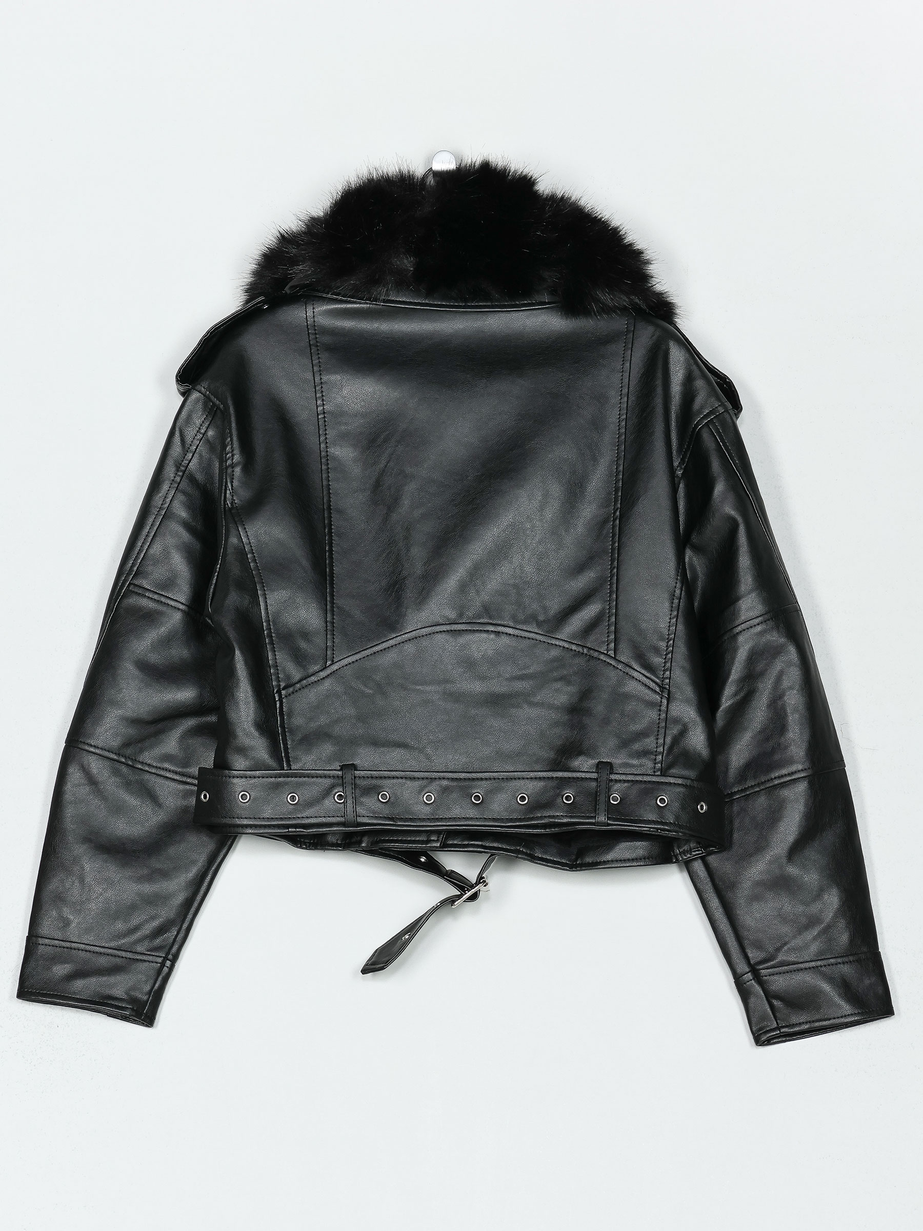 Detalles de chaqueta biker efecto piel con cuello de pelo MF-MF6735-1-BLACK