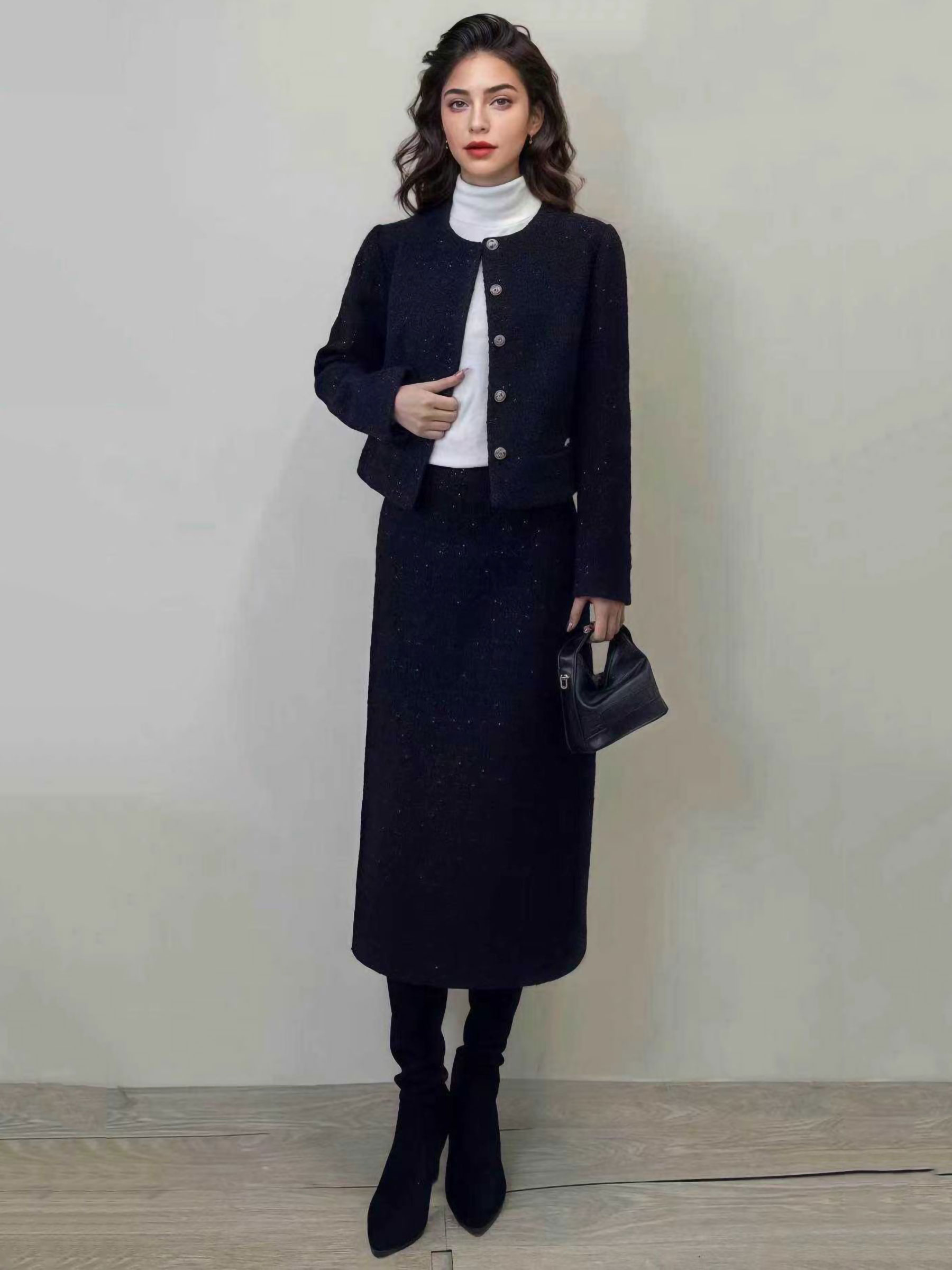 Conjunto de chaqueta corta y falda midi de tejido tweed, cuello redondo, cierre de botones y manga larga.
