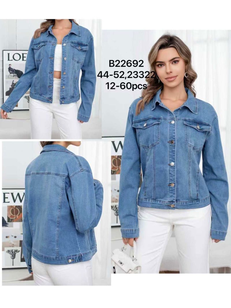 Chaqueta denim clásica. Talla grande. Cuello solapa. Bolsillos de pecho con solapa. Manga larga. Cierre frontal mediante botones metálicos.