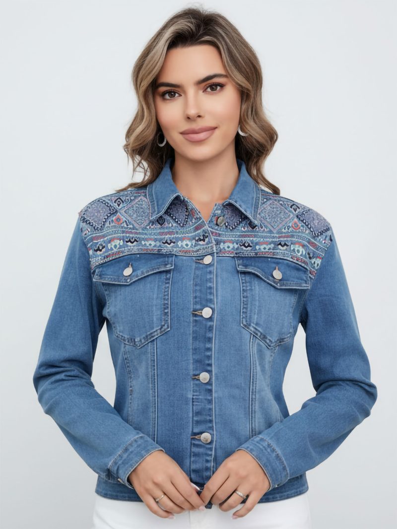 Chaqueta denim bordada. Canesú estampado en contraste. Cuello solapa. Bolsillos de pecho con tapeta. Manga larga. Cierre frontal mediante botones metálicos.