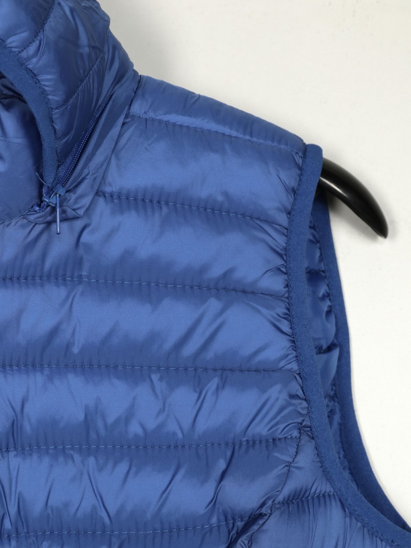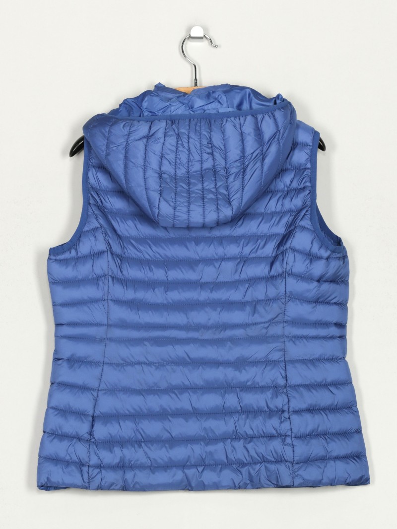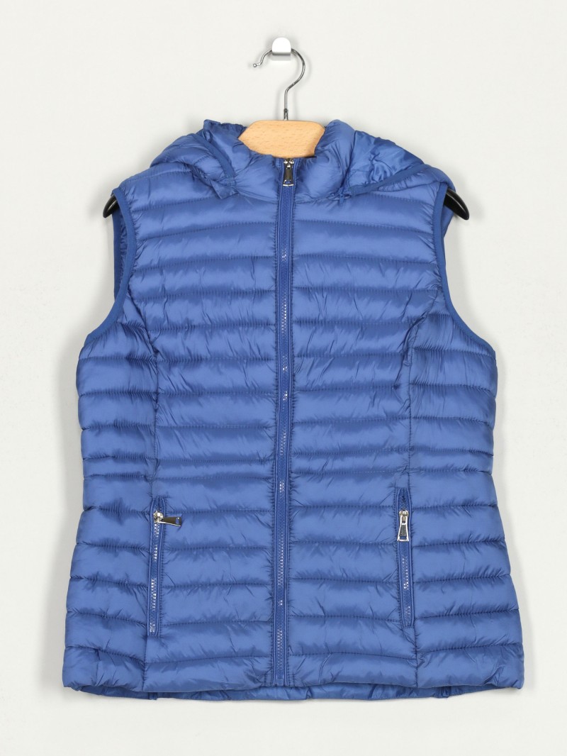 Chaleco acolchado. Ultra ligero. Capucha desmontable. Bolsillos laterales. Cuello subido. Cierre con cremallera central.