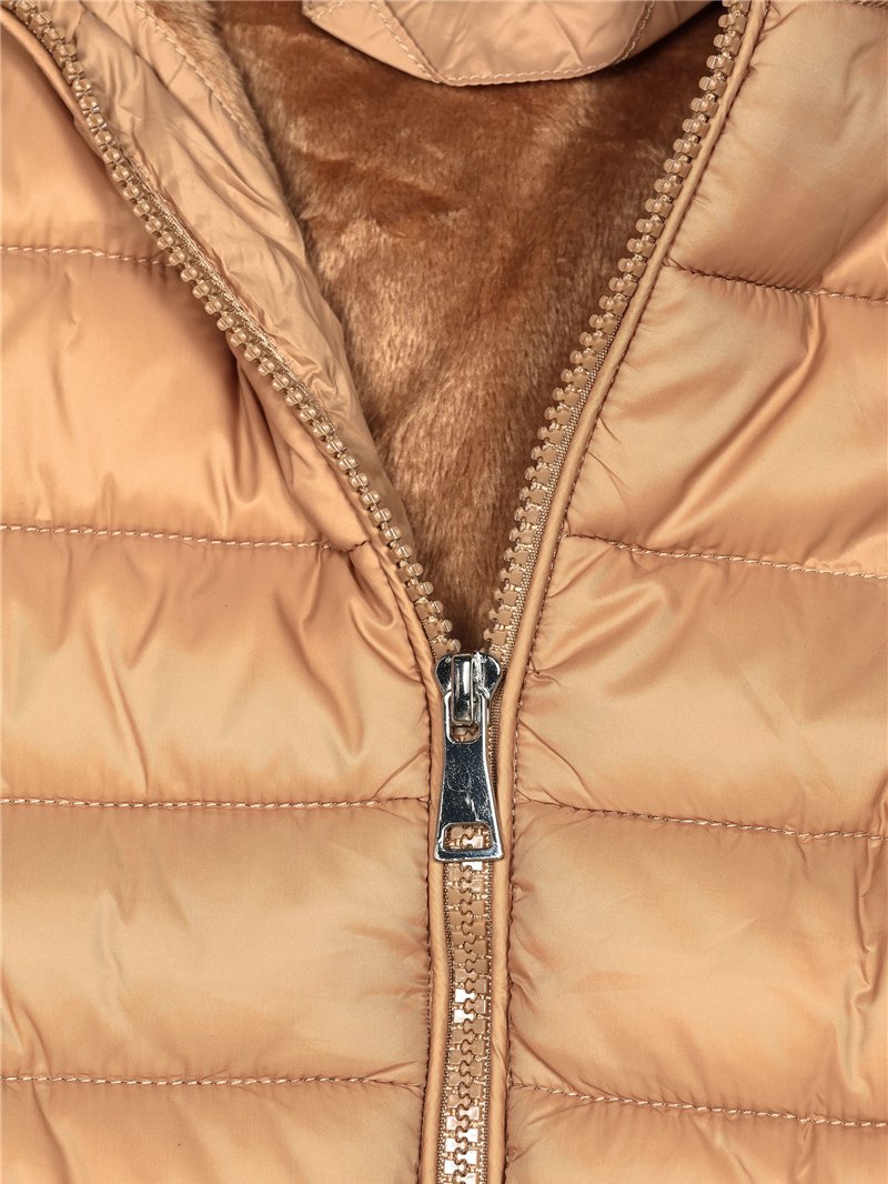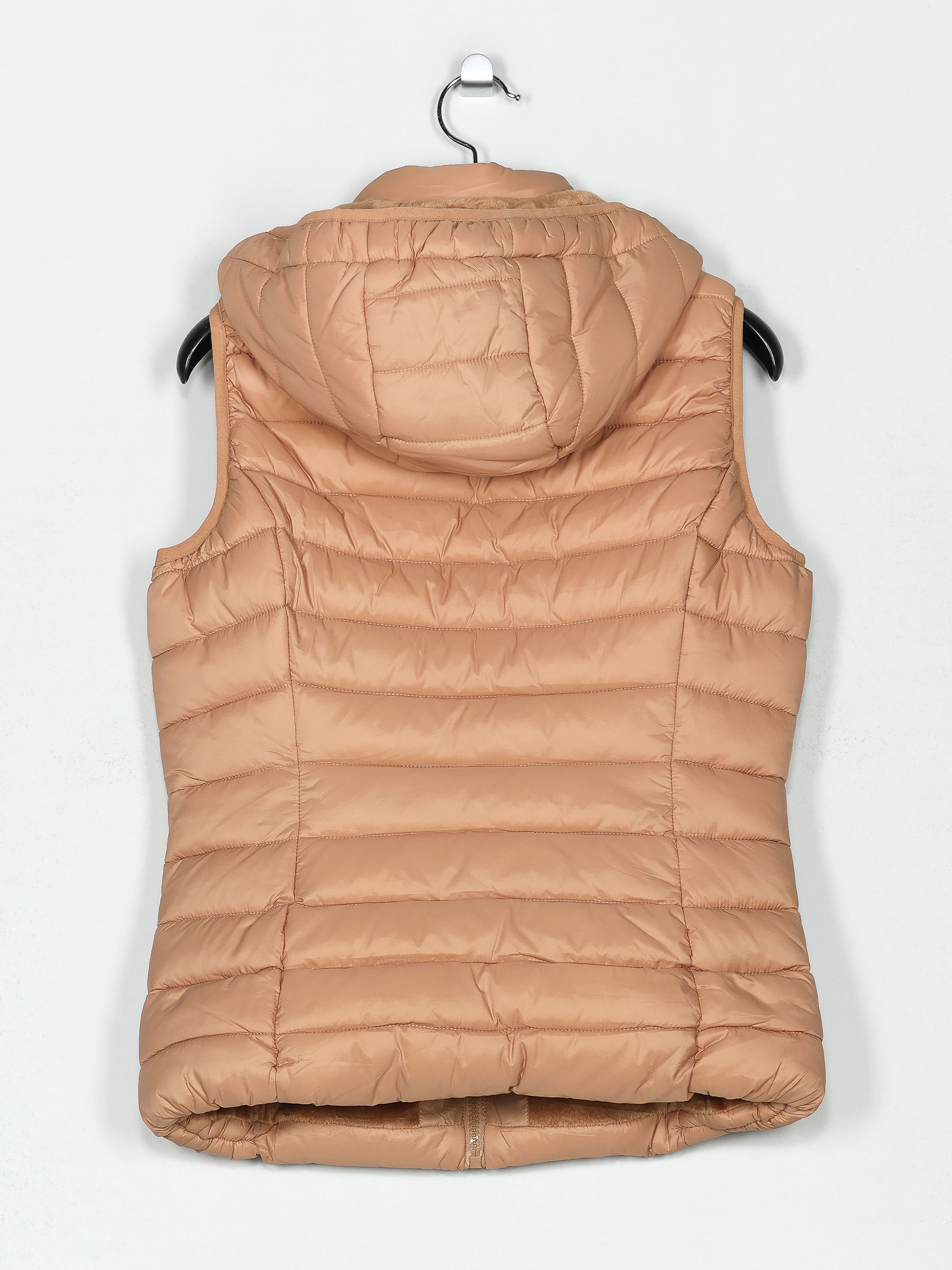 Chaleco acolchado. Acabado interior efecto pelo. Capucha desmontable. Cierre de cremallera central. Manga sisa.