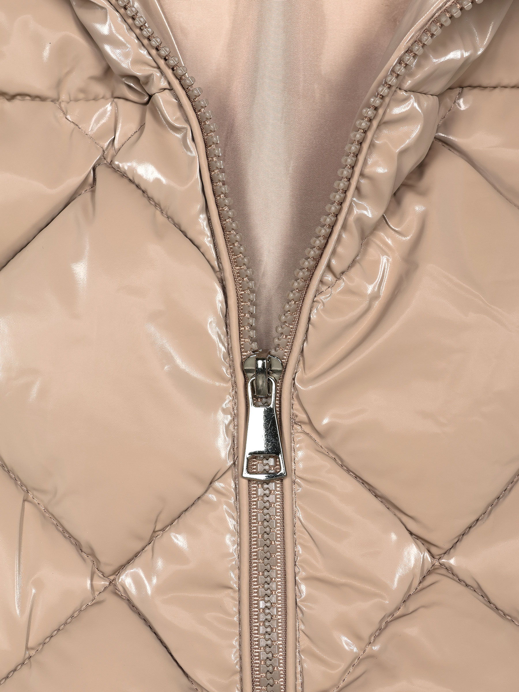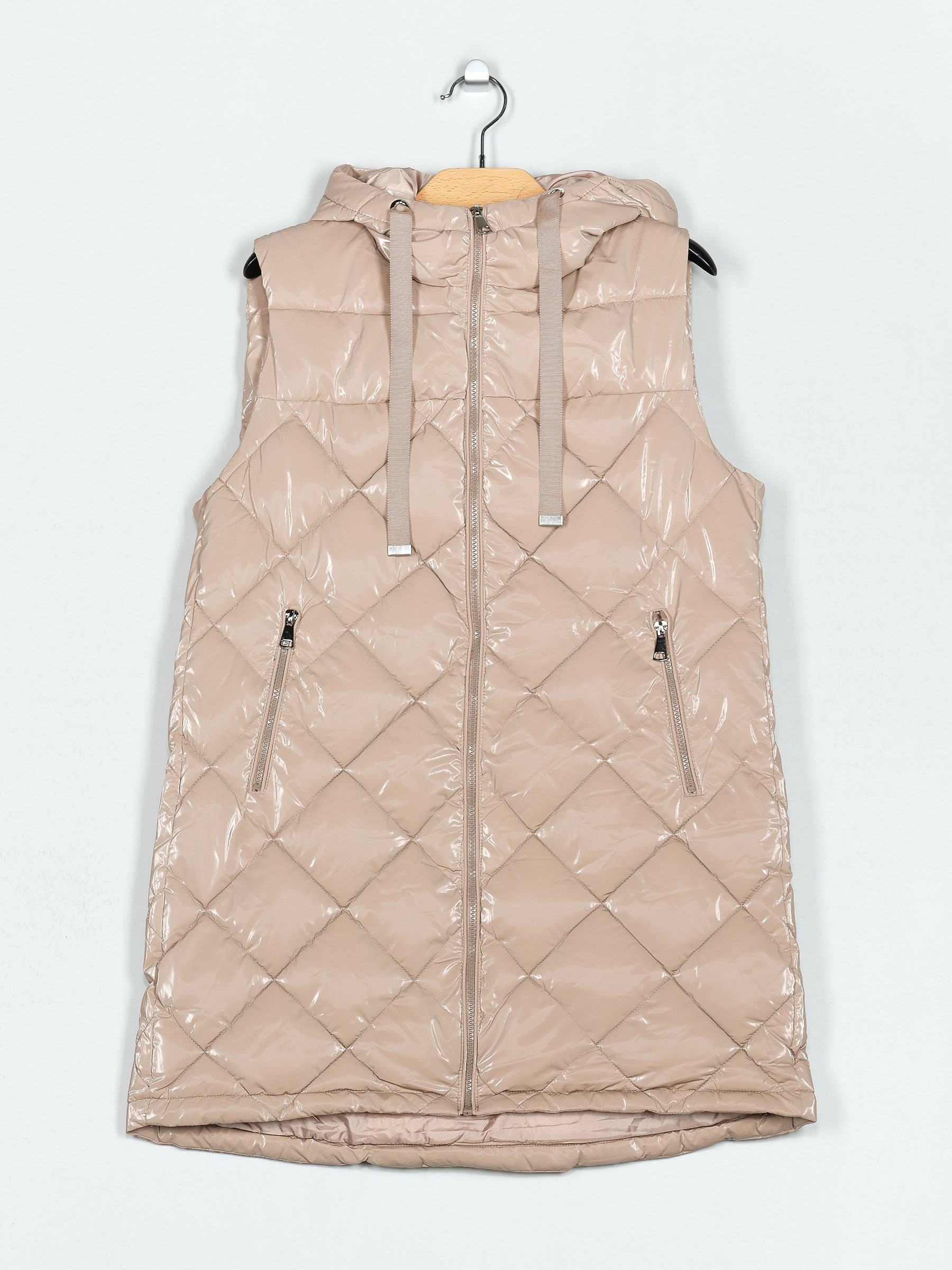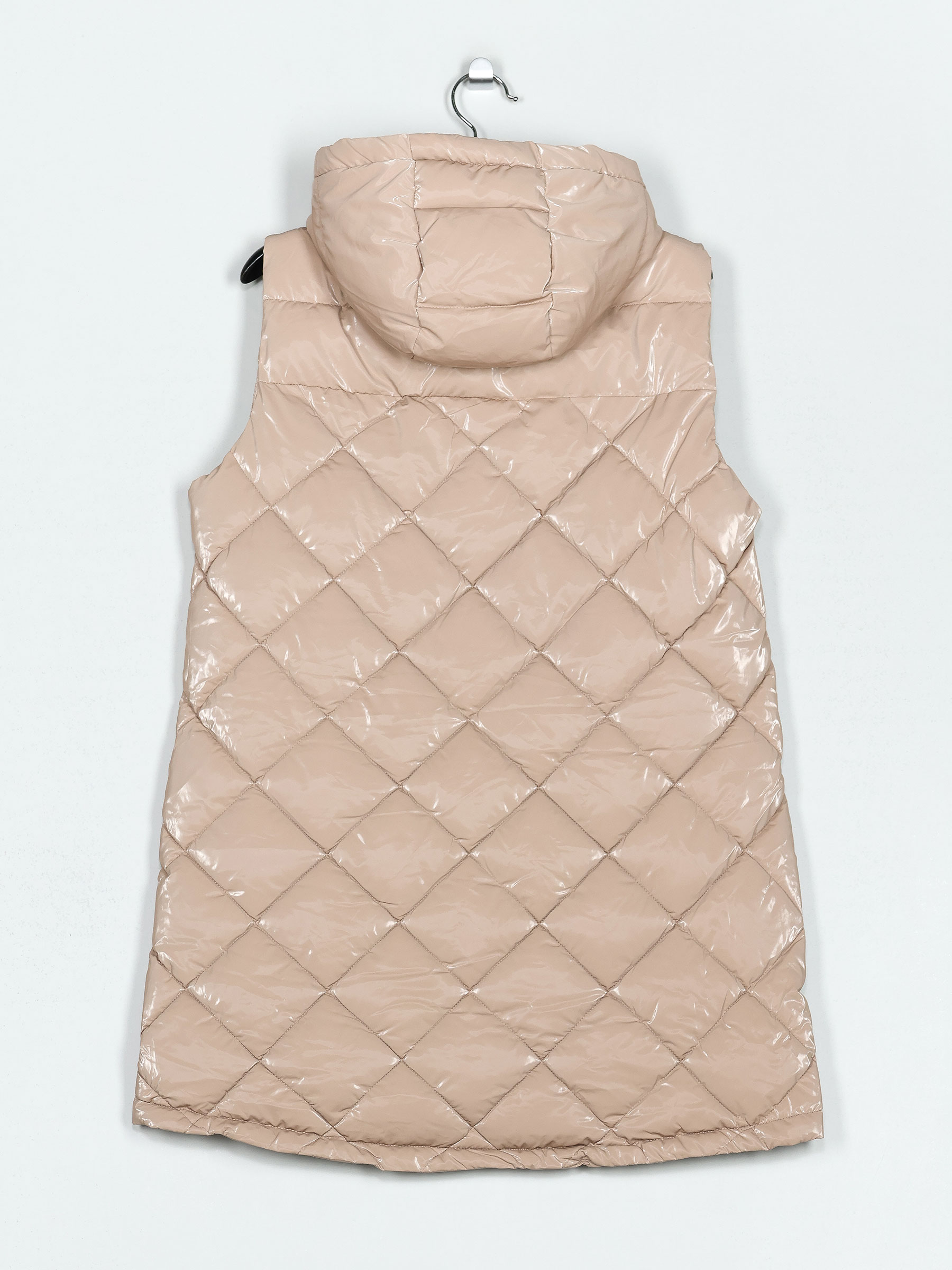 Chaleco largo efecto charol. Water repellent. Acolchado. Capucha no desmontable. Bolsillos laterales. Cuello subido. Cierre con cremallera central.