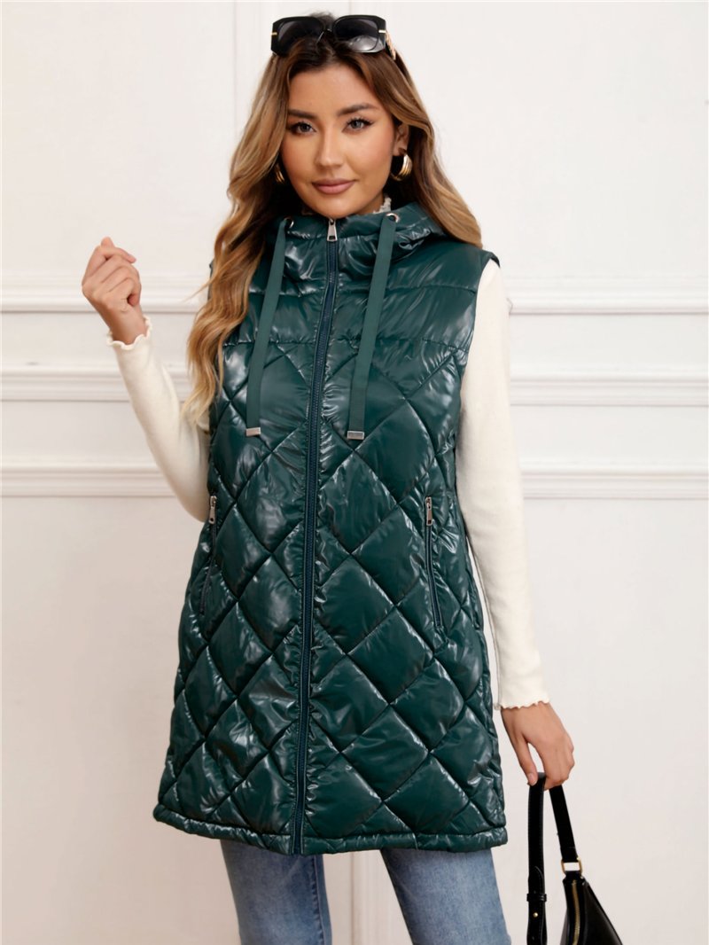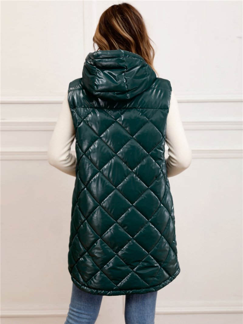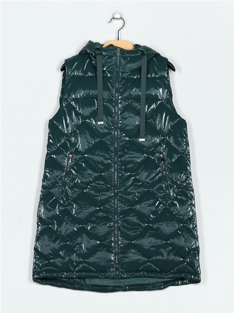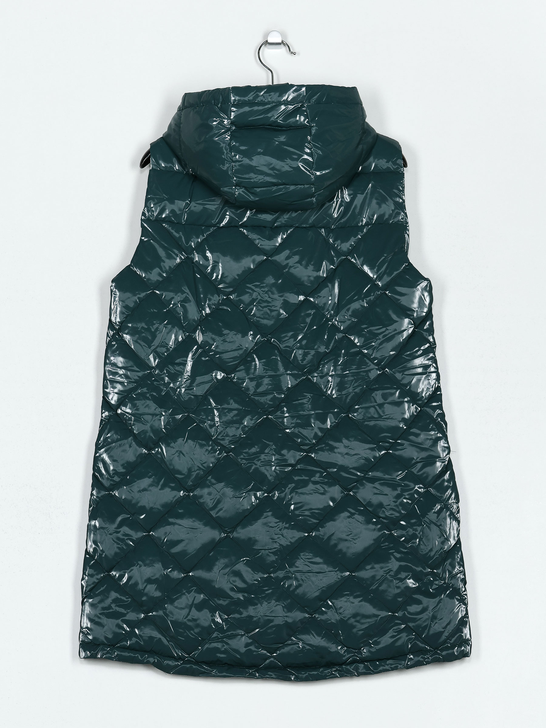 Chaleco largo efecto charol. Water repellent. Acolchado. Capucha no desmontable. Bolsillos laterales. Cuello subido. Cierre con cremallera central.