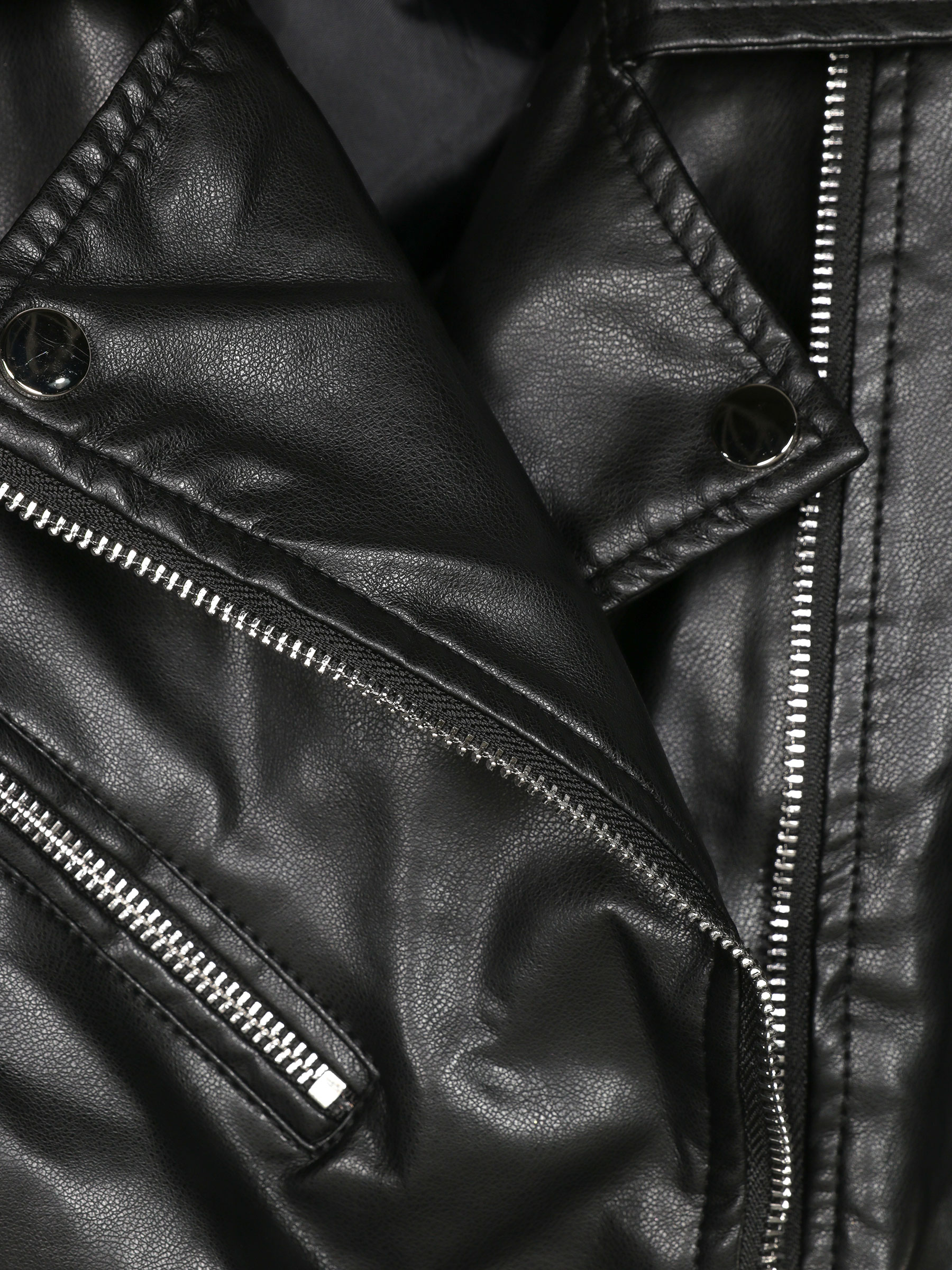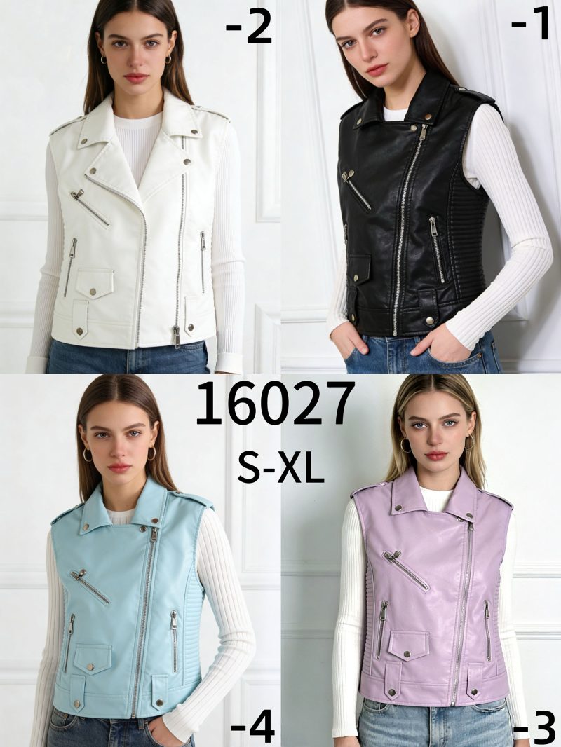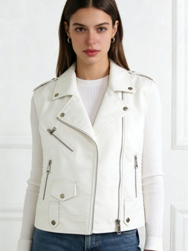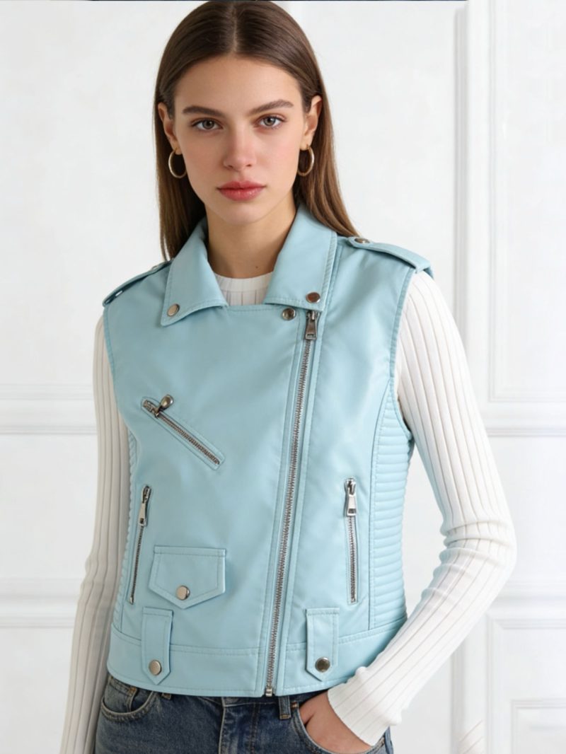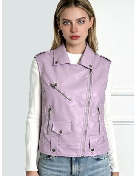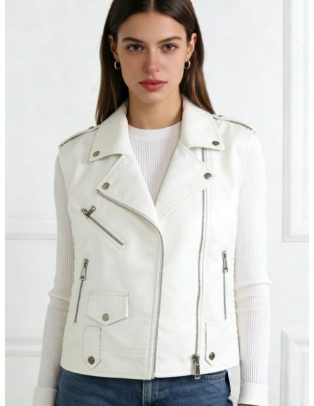 Chaleco biker. Efecto piel. Bolsillos laterales. Cuello solapa. Cierre asimétrico con cremallera metálica.