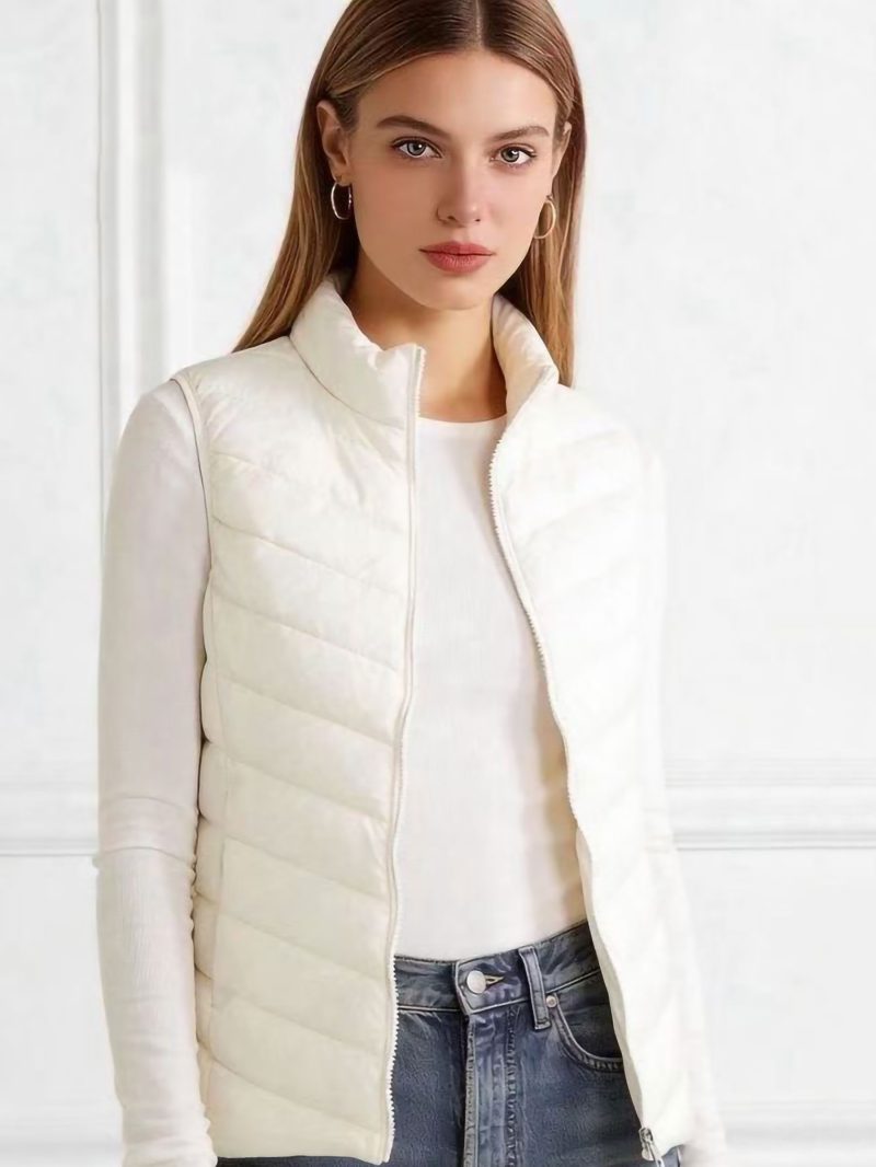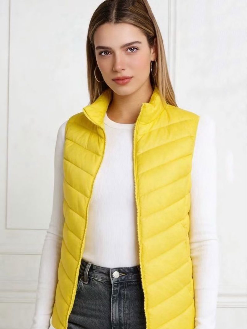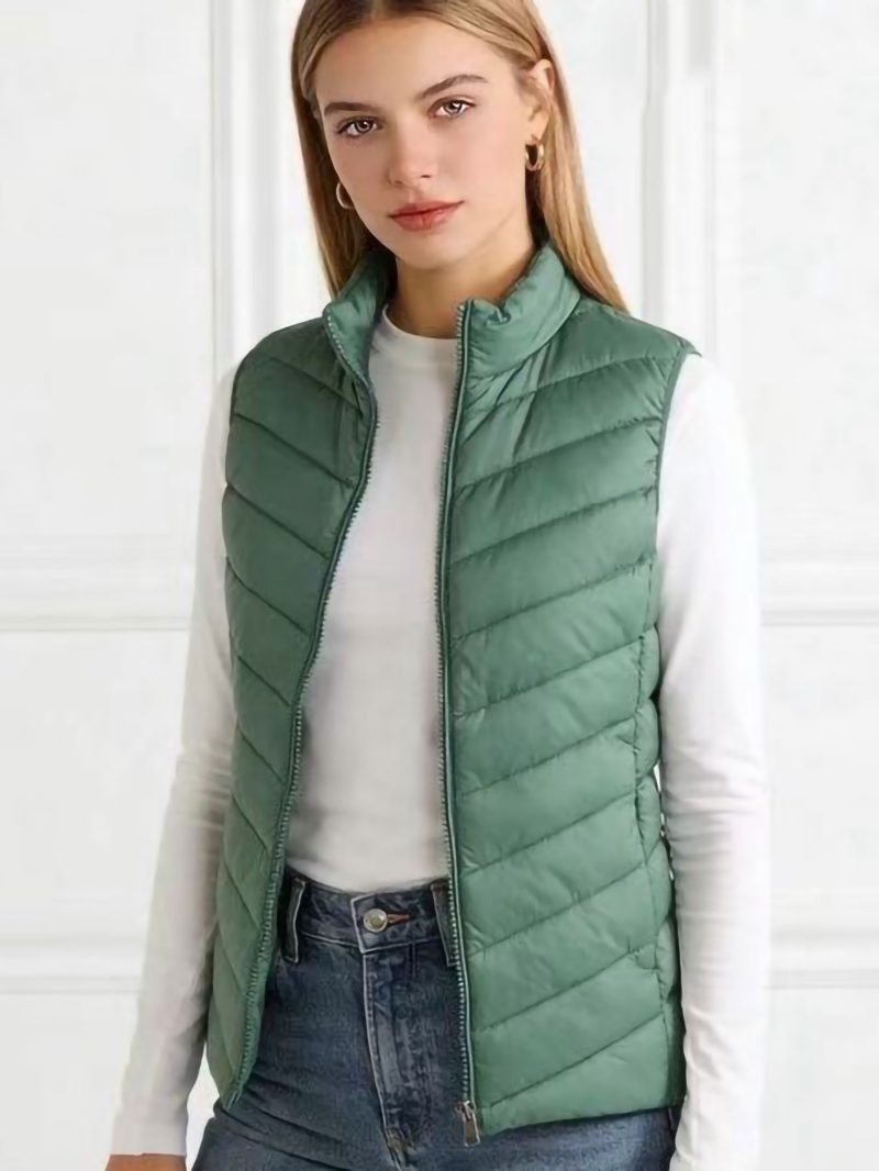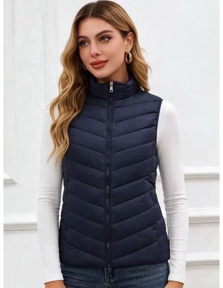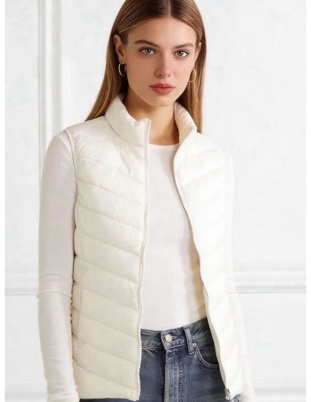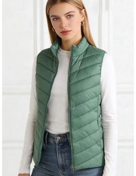 Chaleco acolchado diagonal. Cuello subido. Cierre con cremallera. Bolsillos delanteros.
