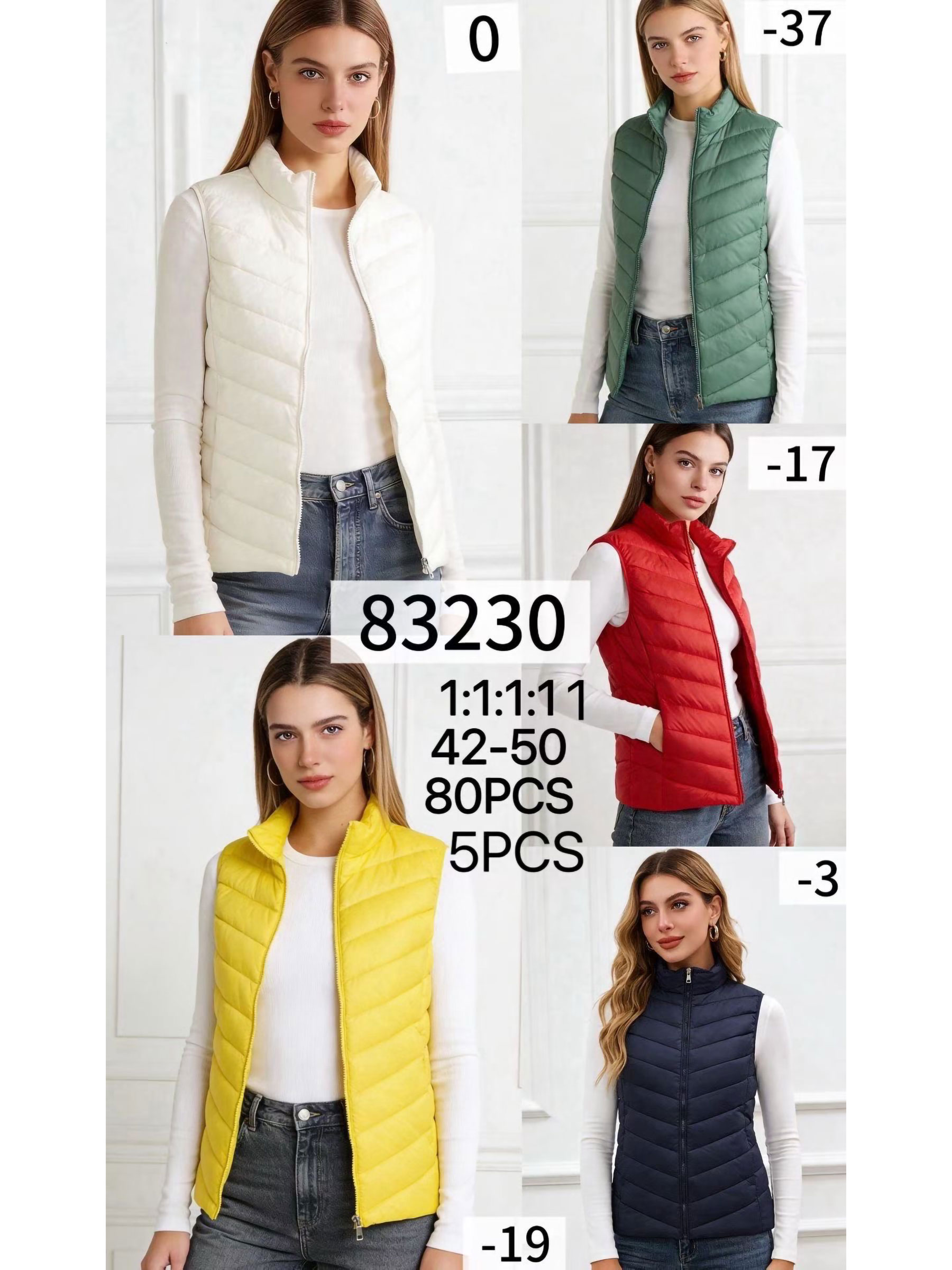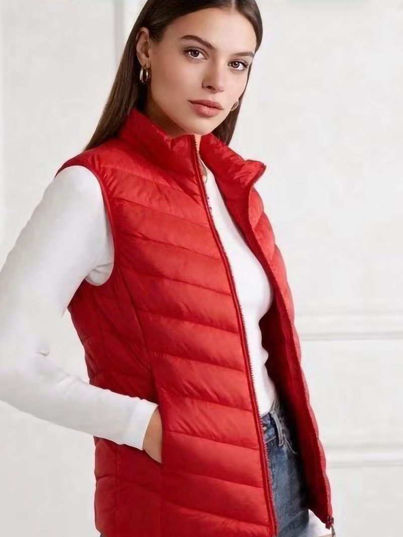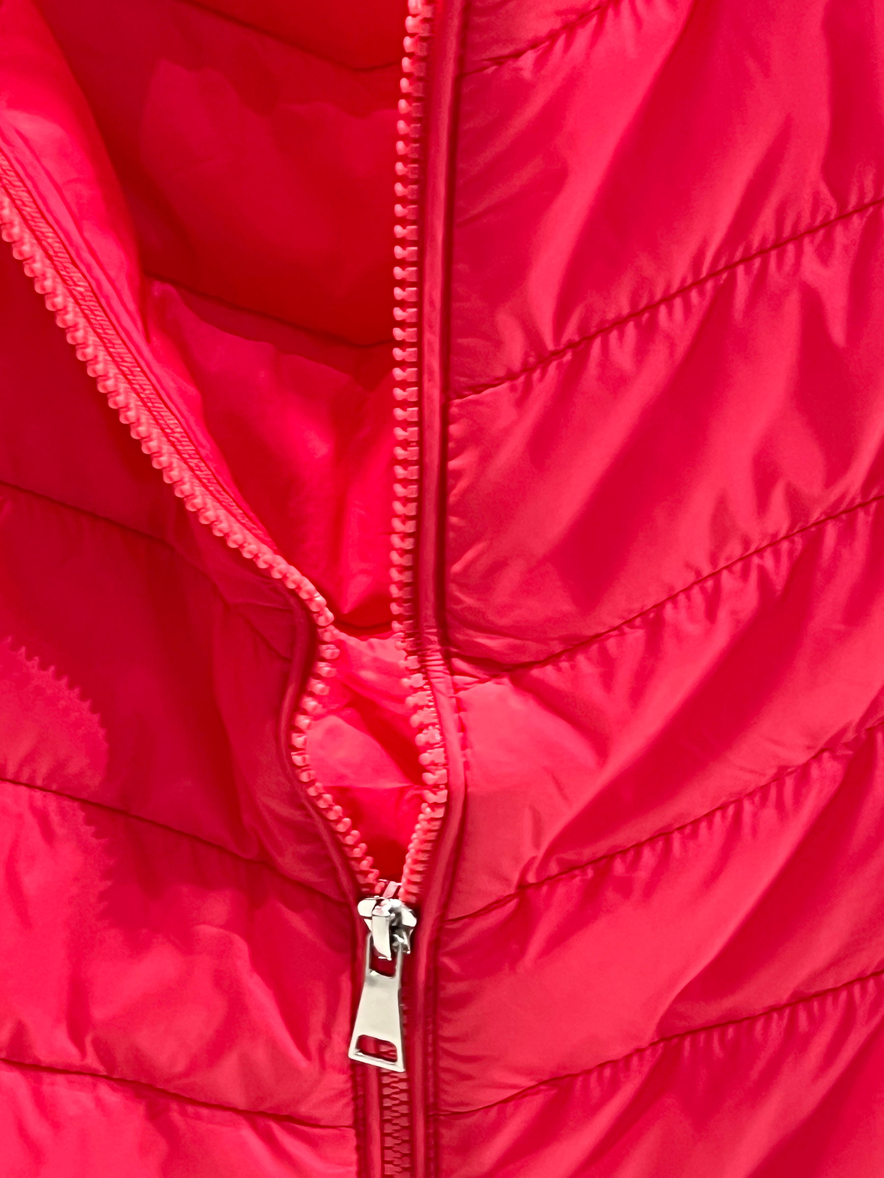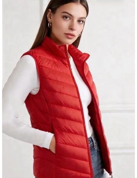 Chaleco acolchado diagonal. Cuello subido. Cierre con cremallera. Bolsillos delanteros.