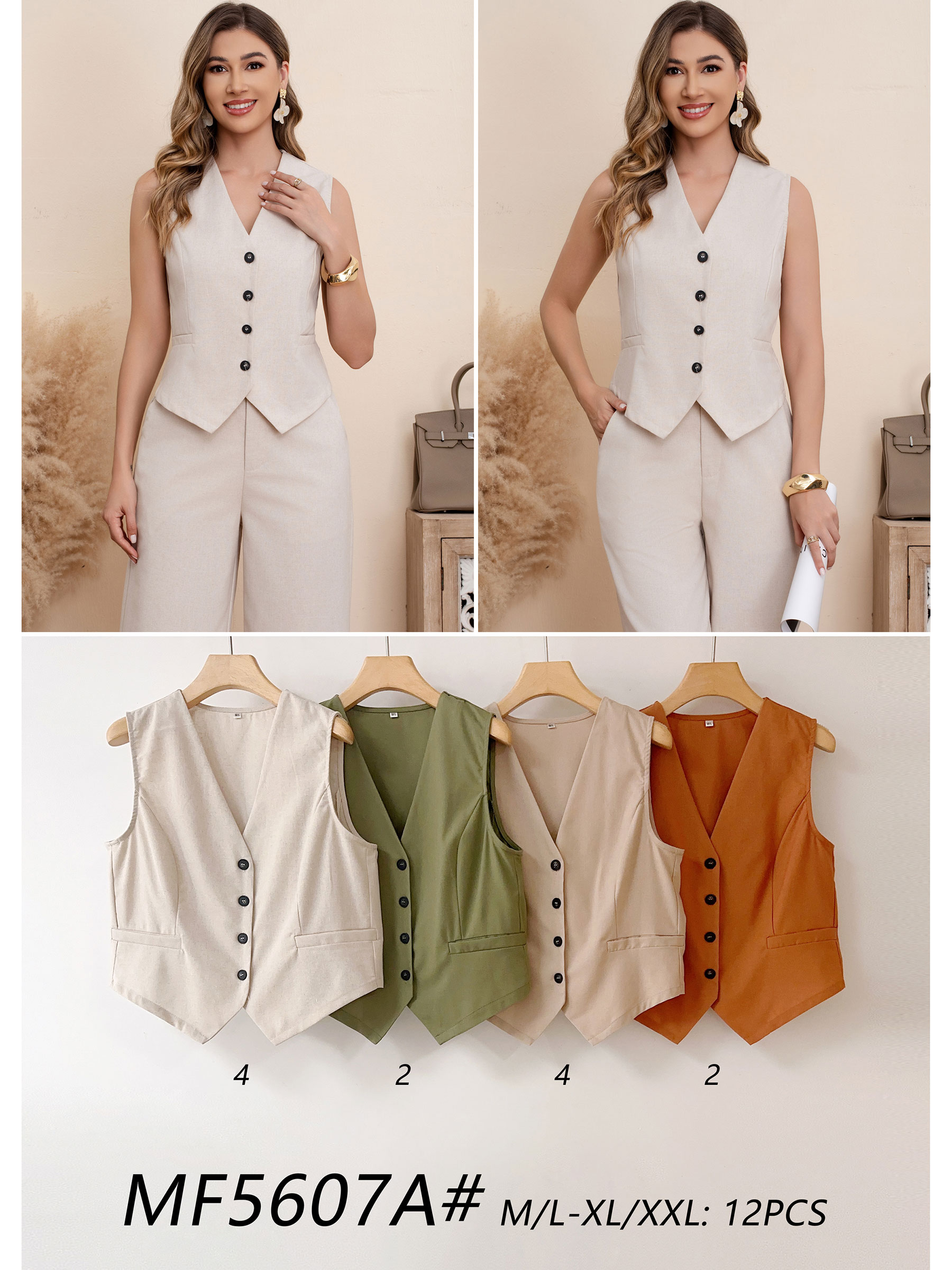 Chaleco sastre sin mangas con escote pico y botonadura. Bolsillos falsos delanteros y corte entallado.