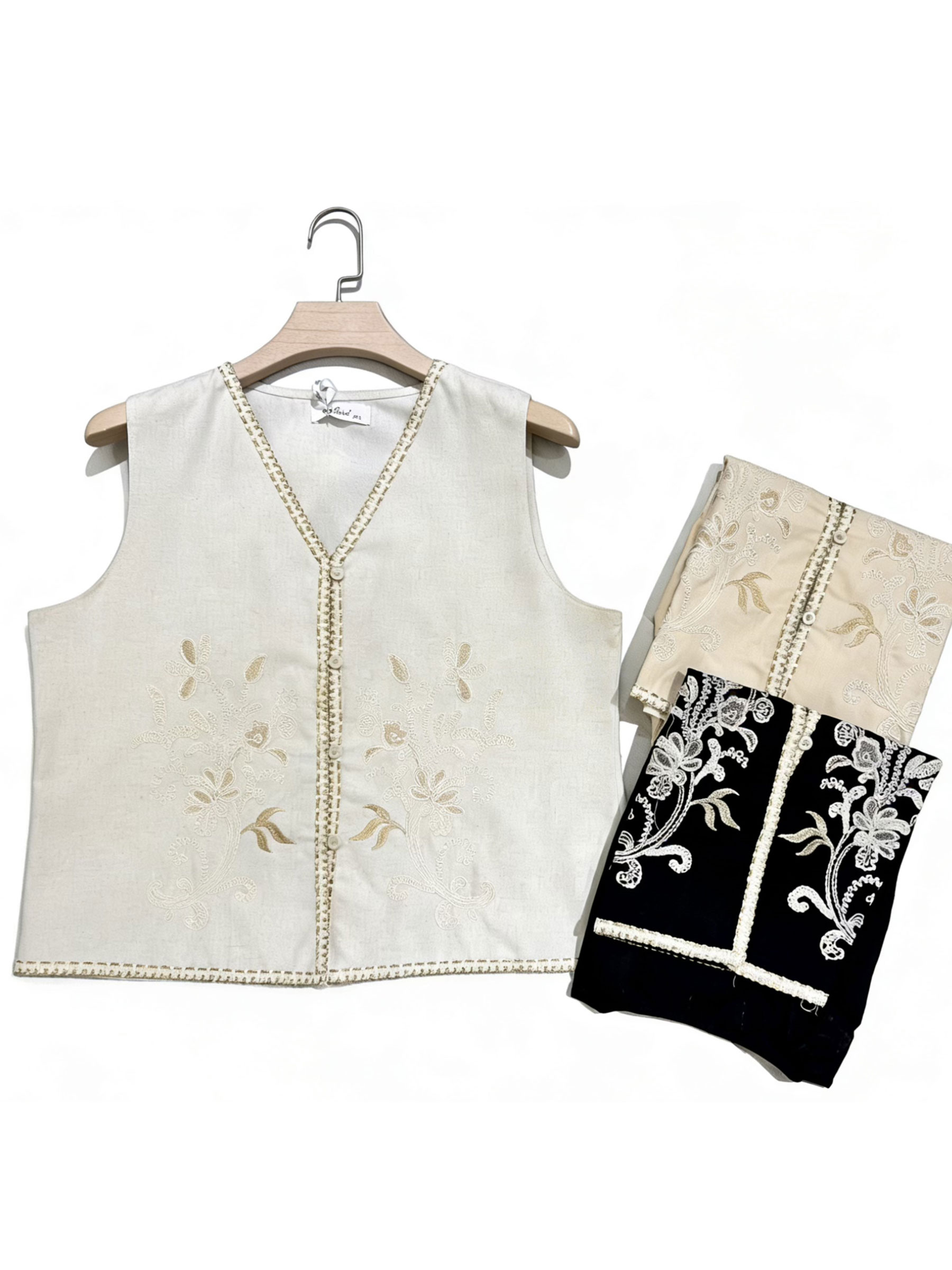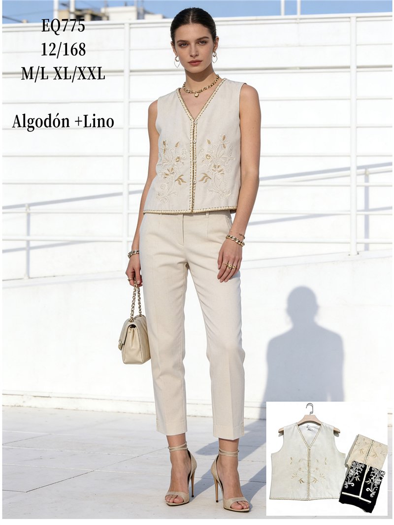 Nuevo Mín. 6 Chalecos Conjunto efecto lino bordado: de chaleco y pantalón DB-X5731 Tallas: S-M-L.Colección: Primavera/Verano 2026. Ver precio