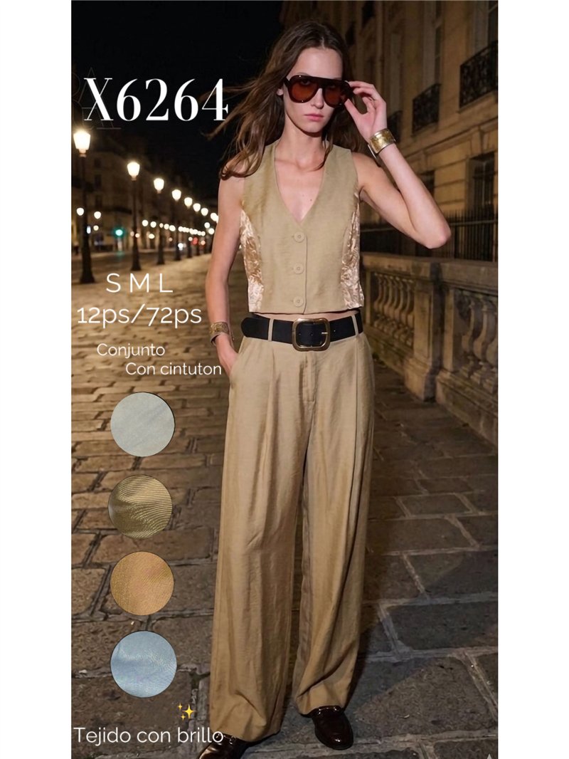 Conjunto chaleco detalle brillante y pantalón palazzo con cinturón
