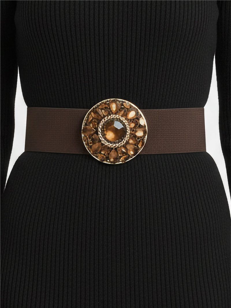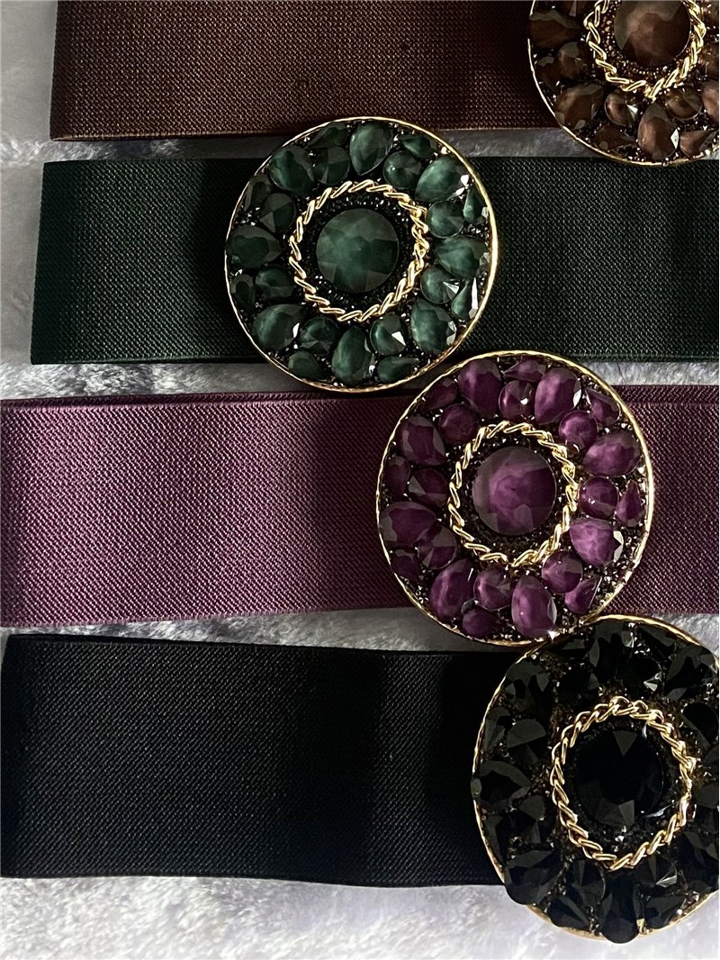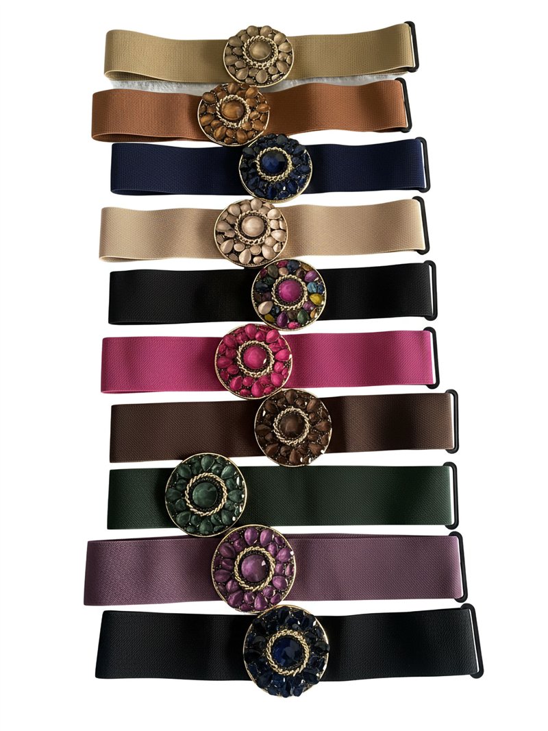 Detalles de cinturón elástico hebilla redonda con pedrería HY-HP-51137