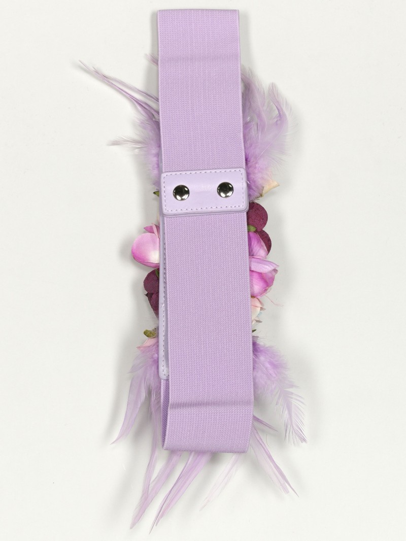 Cinturón elástico con aplicación de flores y plumas. Cierre Cierre con botones a presión.