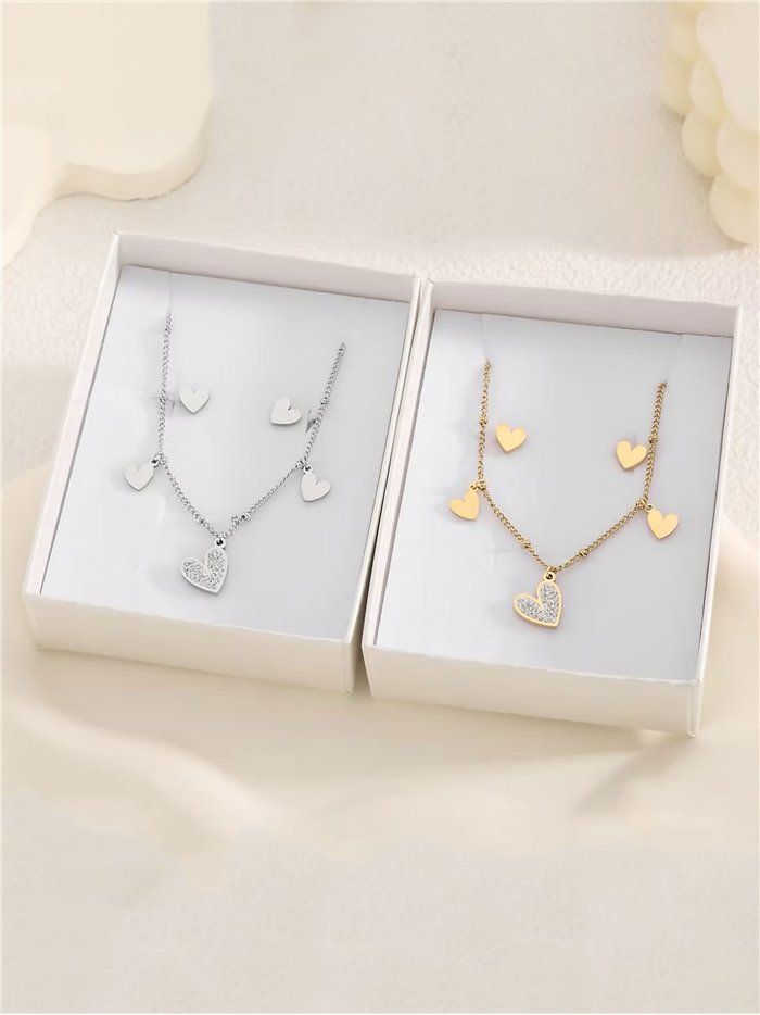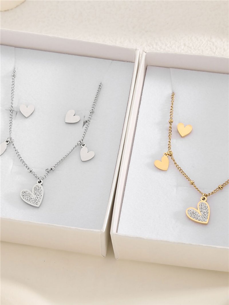 Conjunto de collar cadena charm corazones con circonitas + Pendientes - Acero inoxidable
