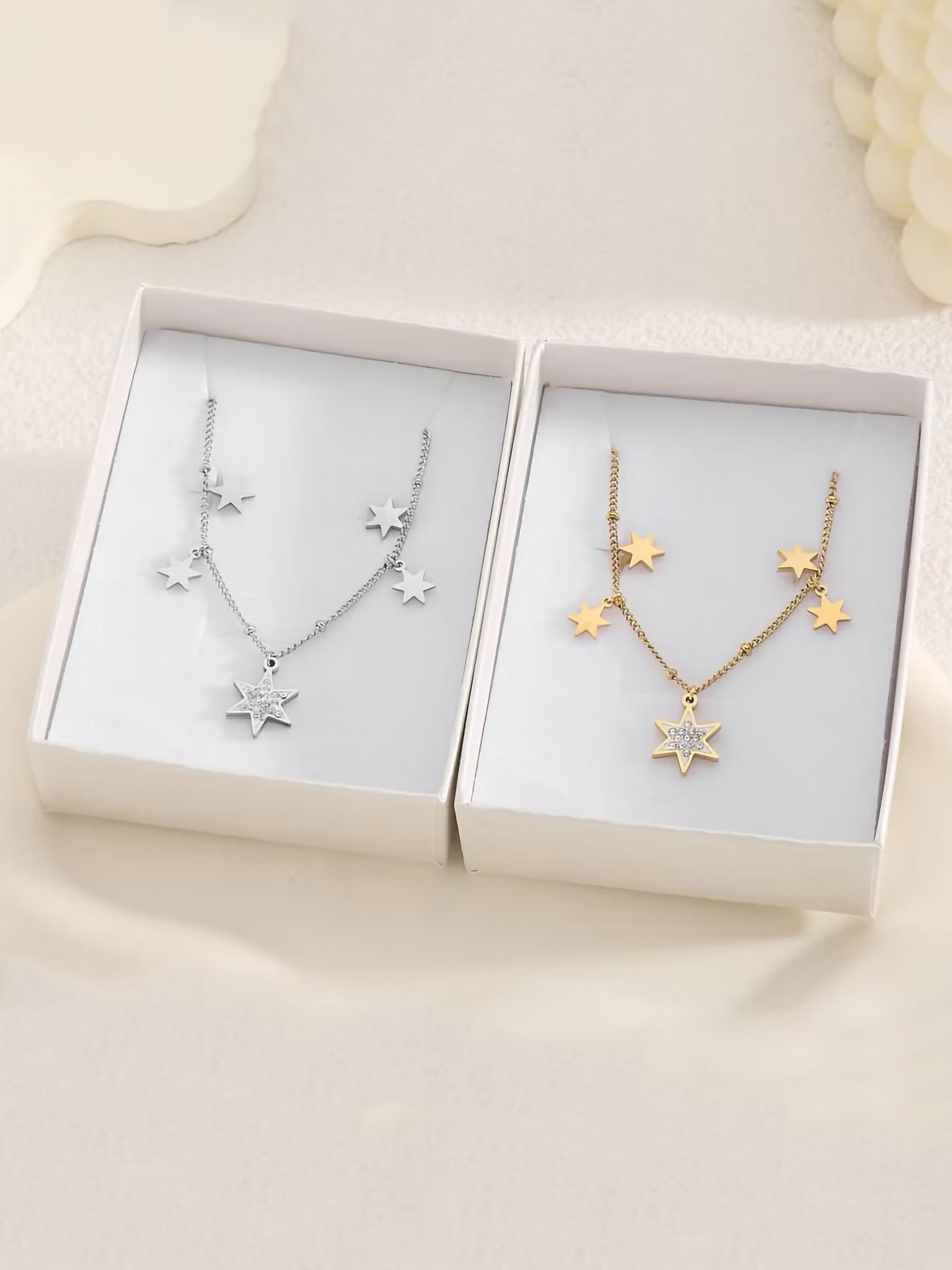 Detalles de conjunto de collar cadena charm estrellas con circonitas + pendientes - acero inoxidable BS-DH61892-DH61893