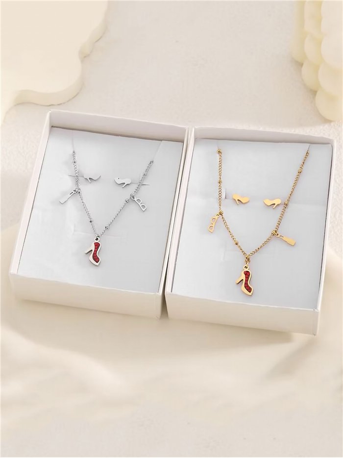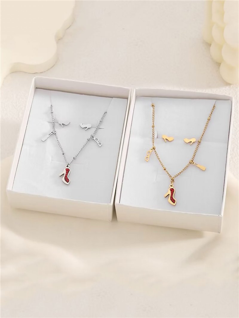 Detalles de conjunto de collar cadena charm tacón con circonitas + pendientes - acero inoxidable BS-DH61894-DH61895