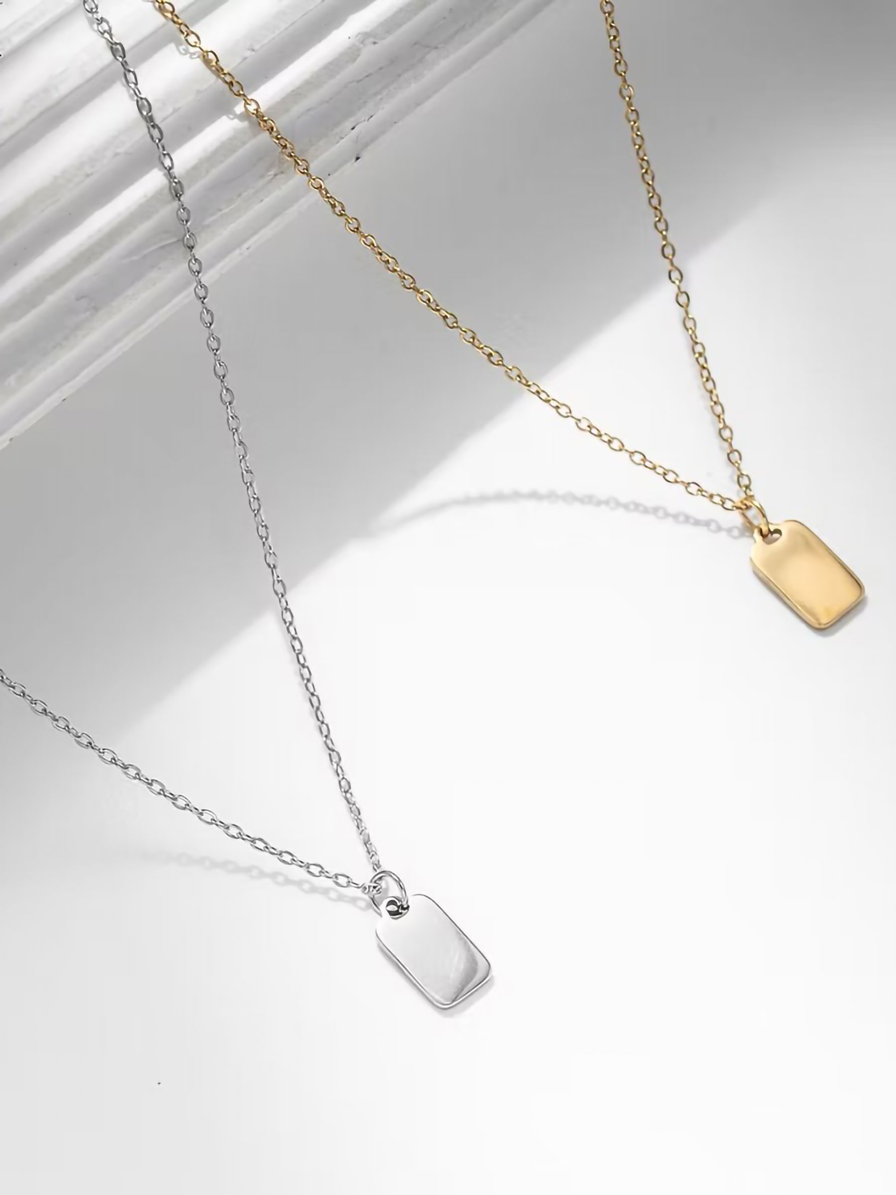 Collar de acero inoxidable con colgante tipo placa de tamaño mini. Cadena fina.