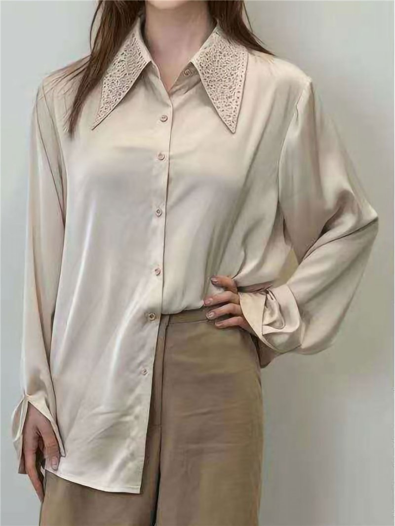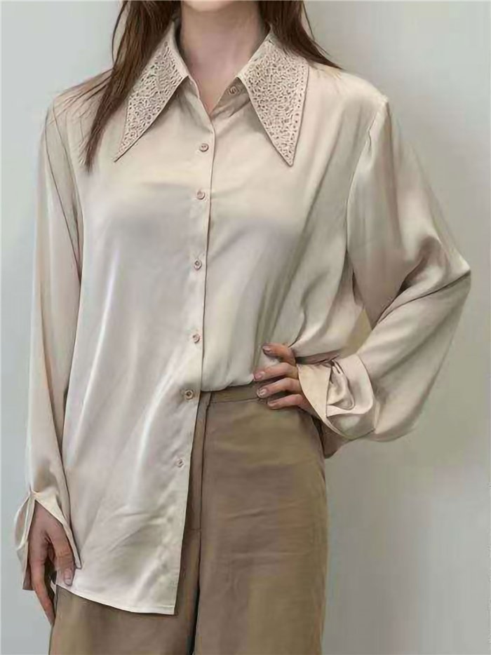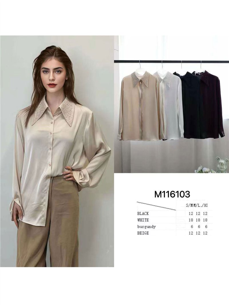 Camisa de satinada. Detalle strass. Cuello solapa. Manga larga. Cierre mediante botones.
