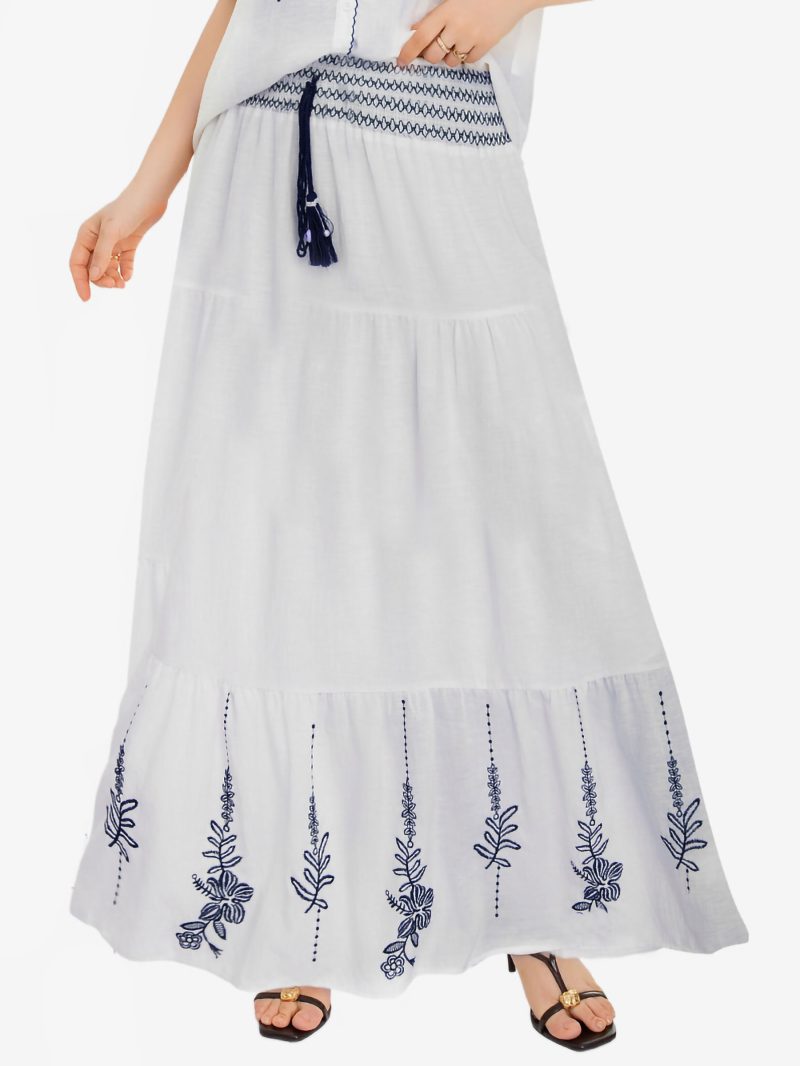 Falda larga bordada con volantes. Cintura nido de abeja. Cordón con borlas.