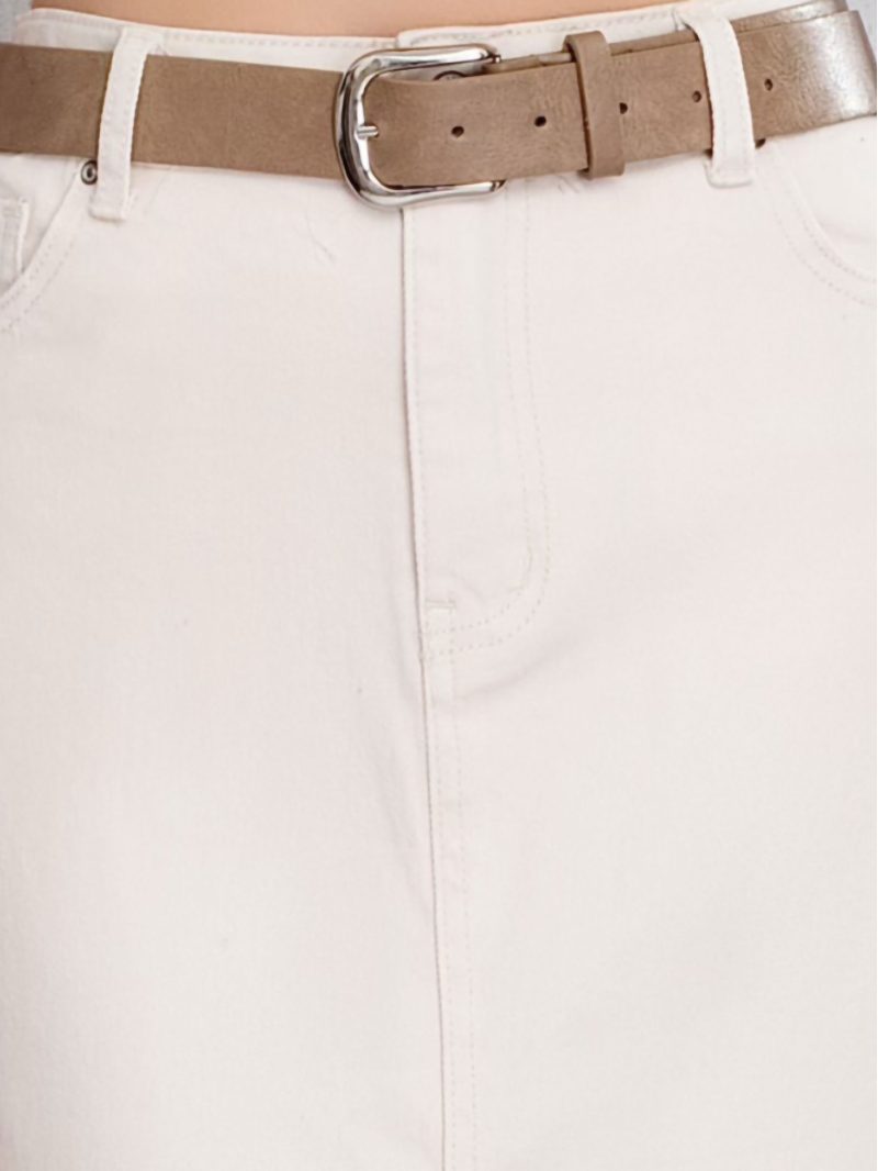 Falda vaquera midi. Color beige. Abertura frontal. Cinco bolsillos. Cierre con cremallera y botón. Largo 68 cm.