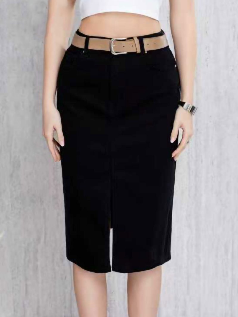 Falda denim midi cinturón con abertura frontal.