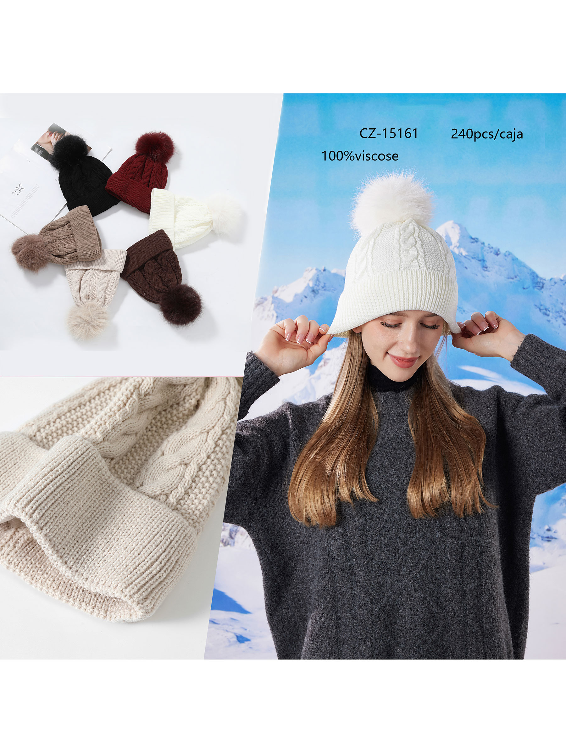 Detalles de gorro punto estructura trenzas pompon HY-CZ-15161