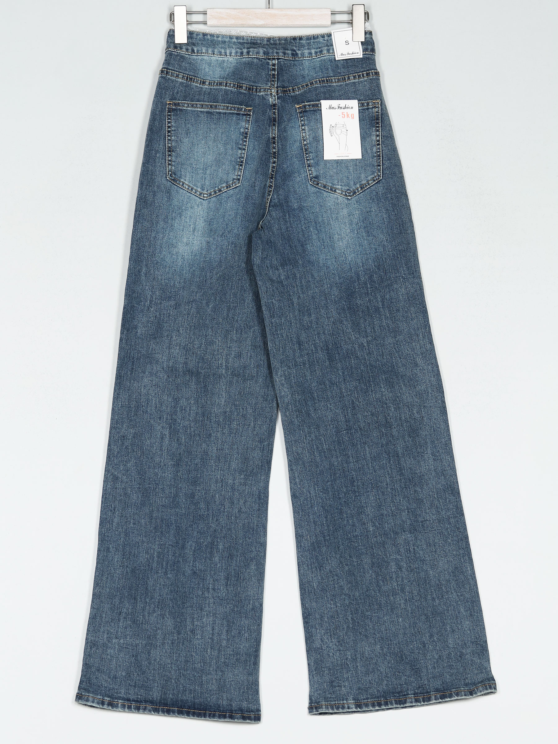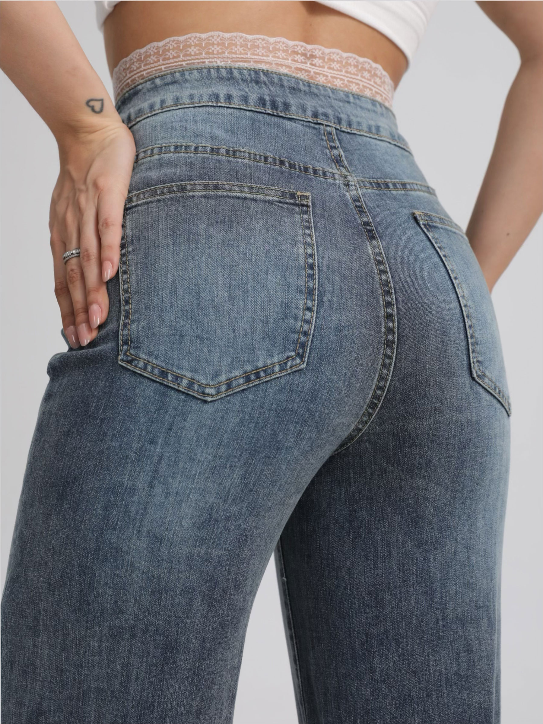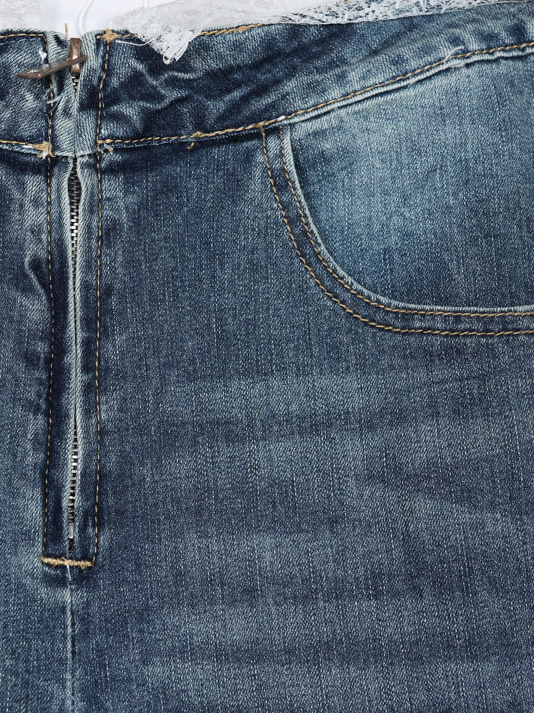 Jeans rectos. Detalle rotos y encaje. Tiro alto. Cuatro bolsillos. Cierre frontal con cremallera.
