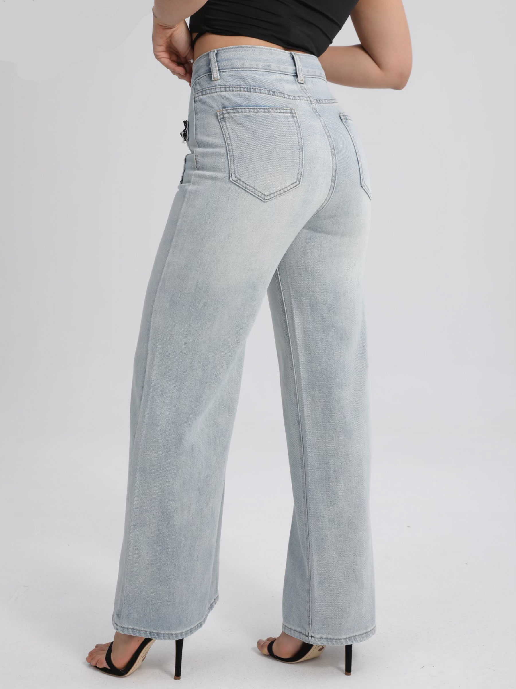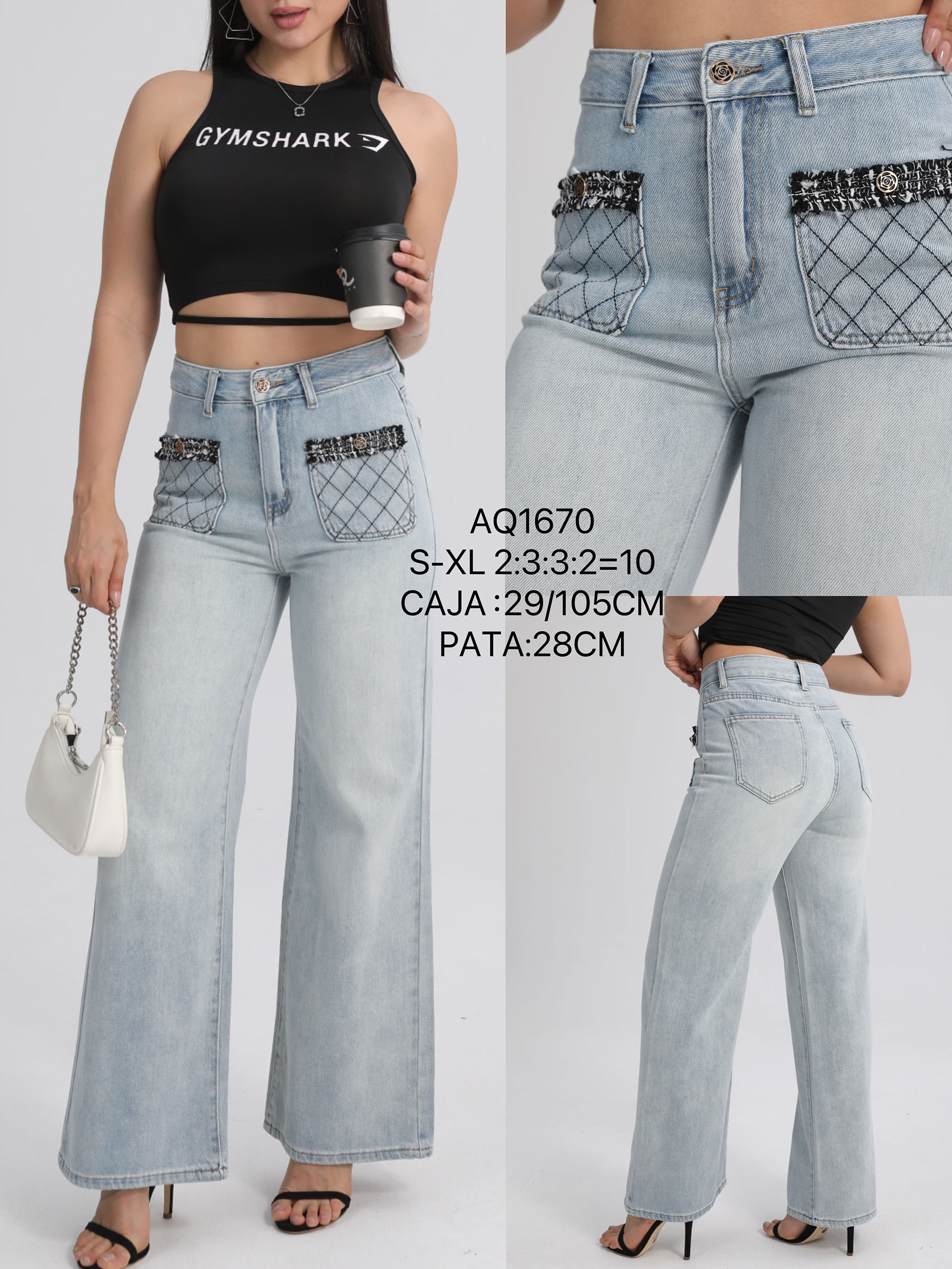 Jeans rectos. Detalle bolsillo tweed. Tejido no elástico. Tiro alto. Cierre frontal con cremallera y botón metálico.