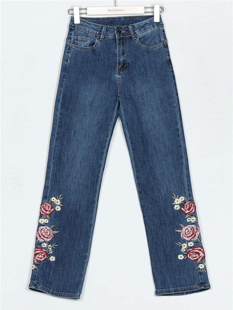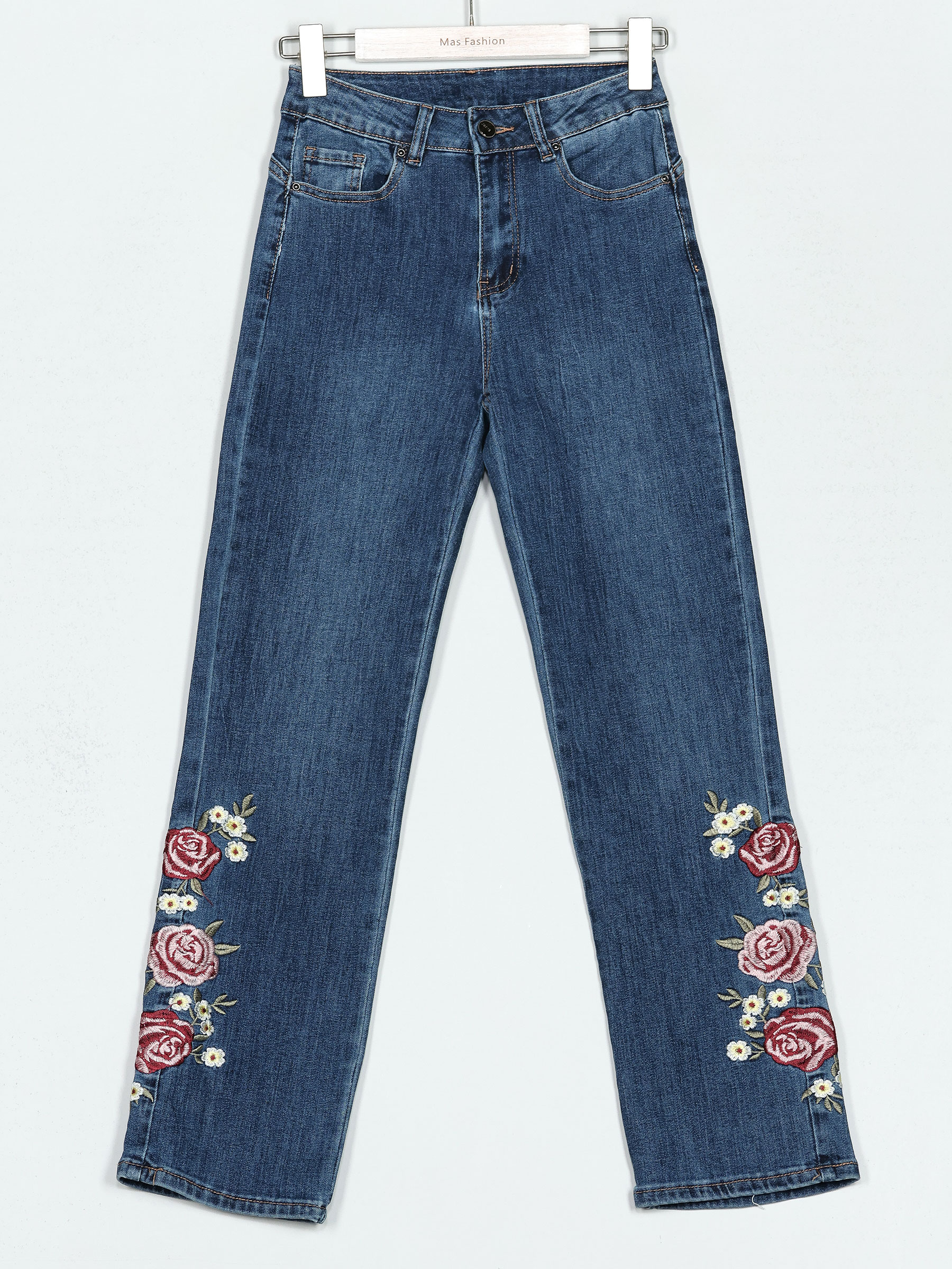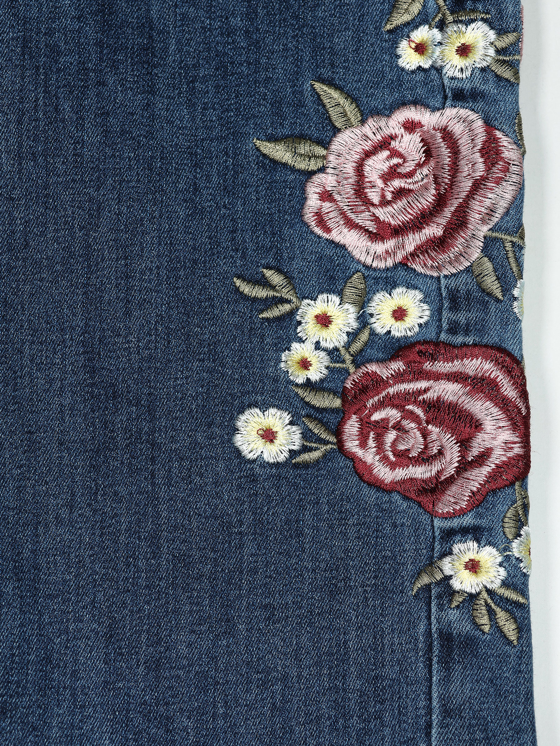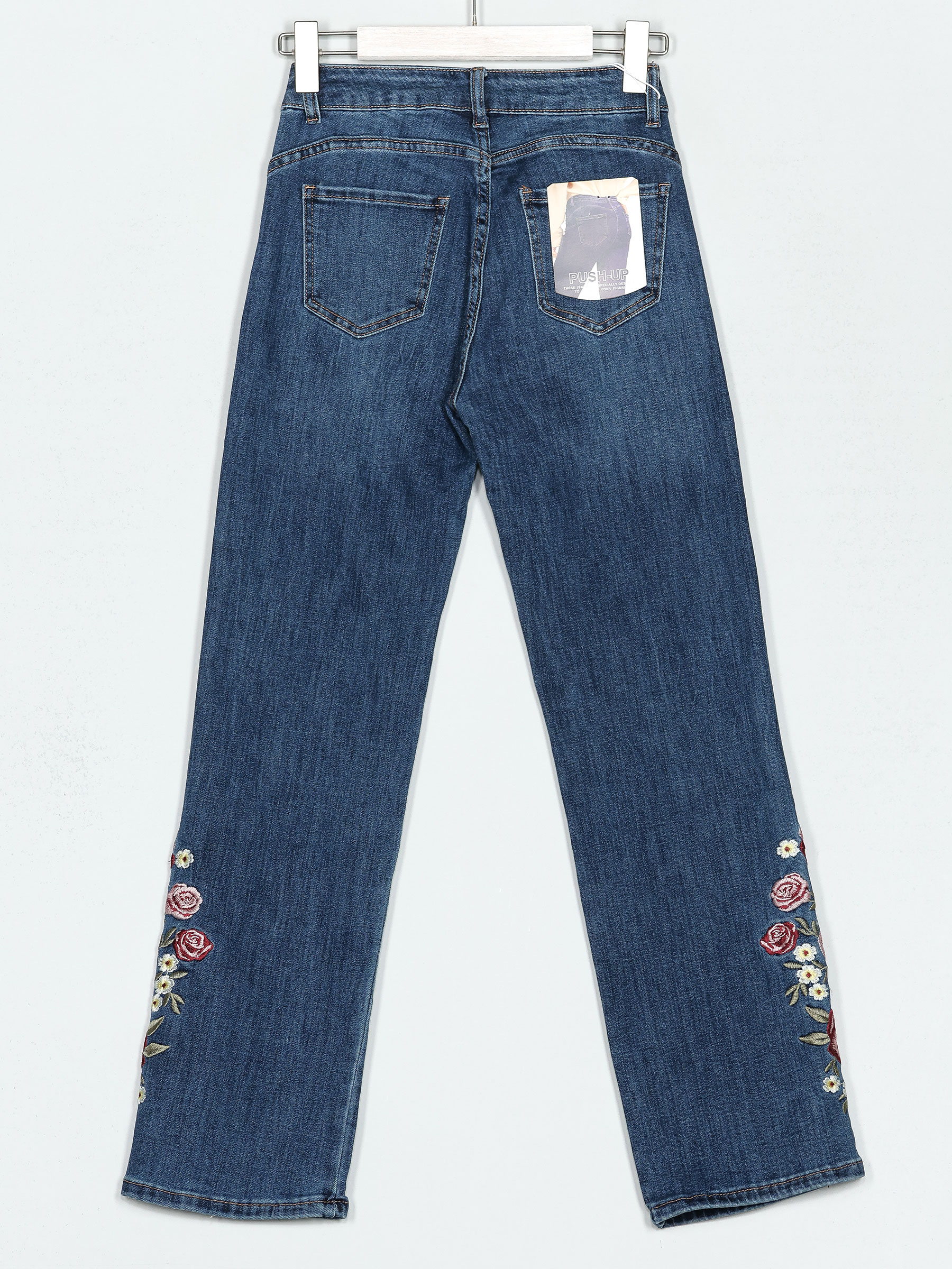 Vaqueros bordados. Tiro alto. Cinco bolsillos. Cierre frontal con cremallera y botón metálico.