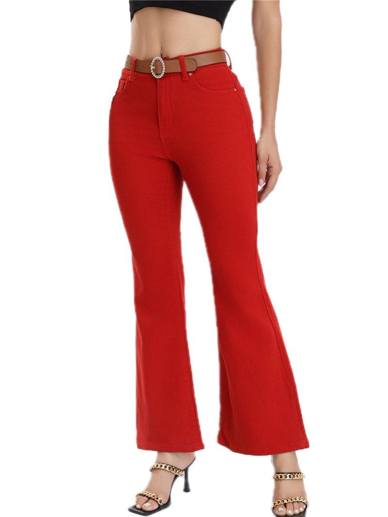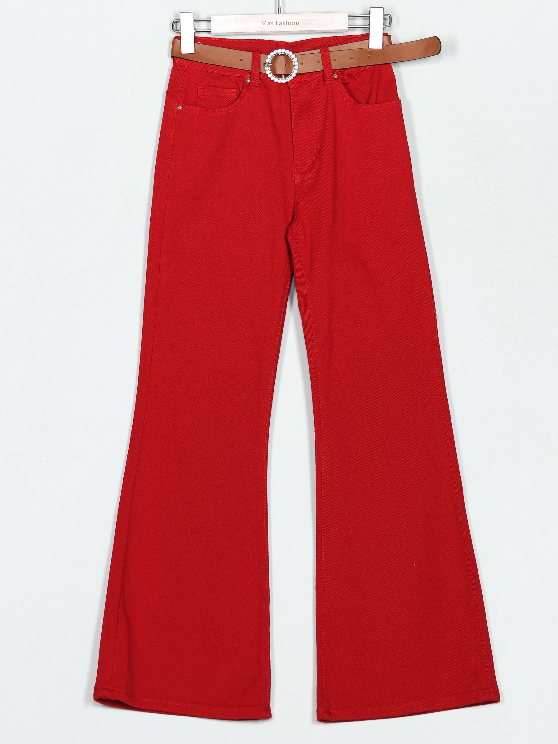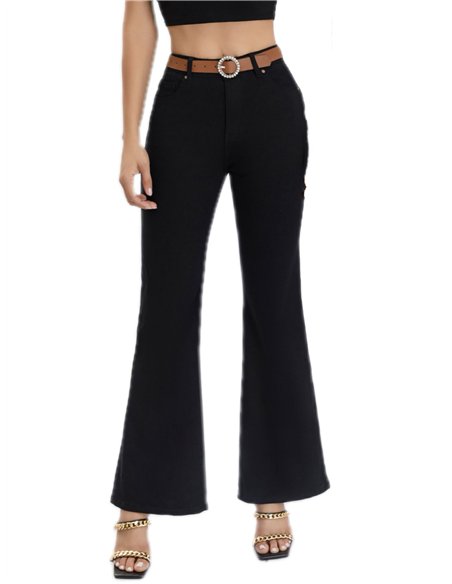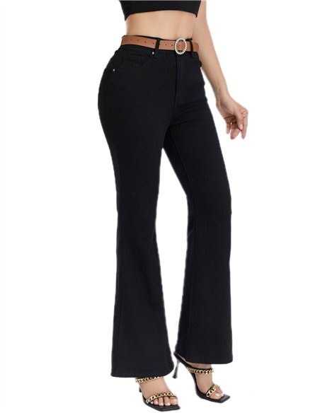 Vaqueros acampanados. Detalle cinturón a contraste. Push up. Tiro alto. Cincos bolsillos. Cierre frontal con cremallera y botón metálico.