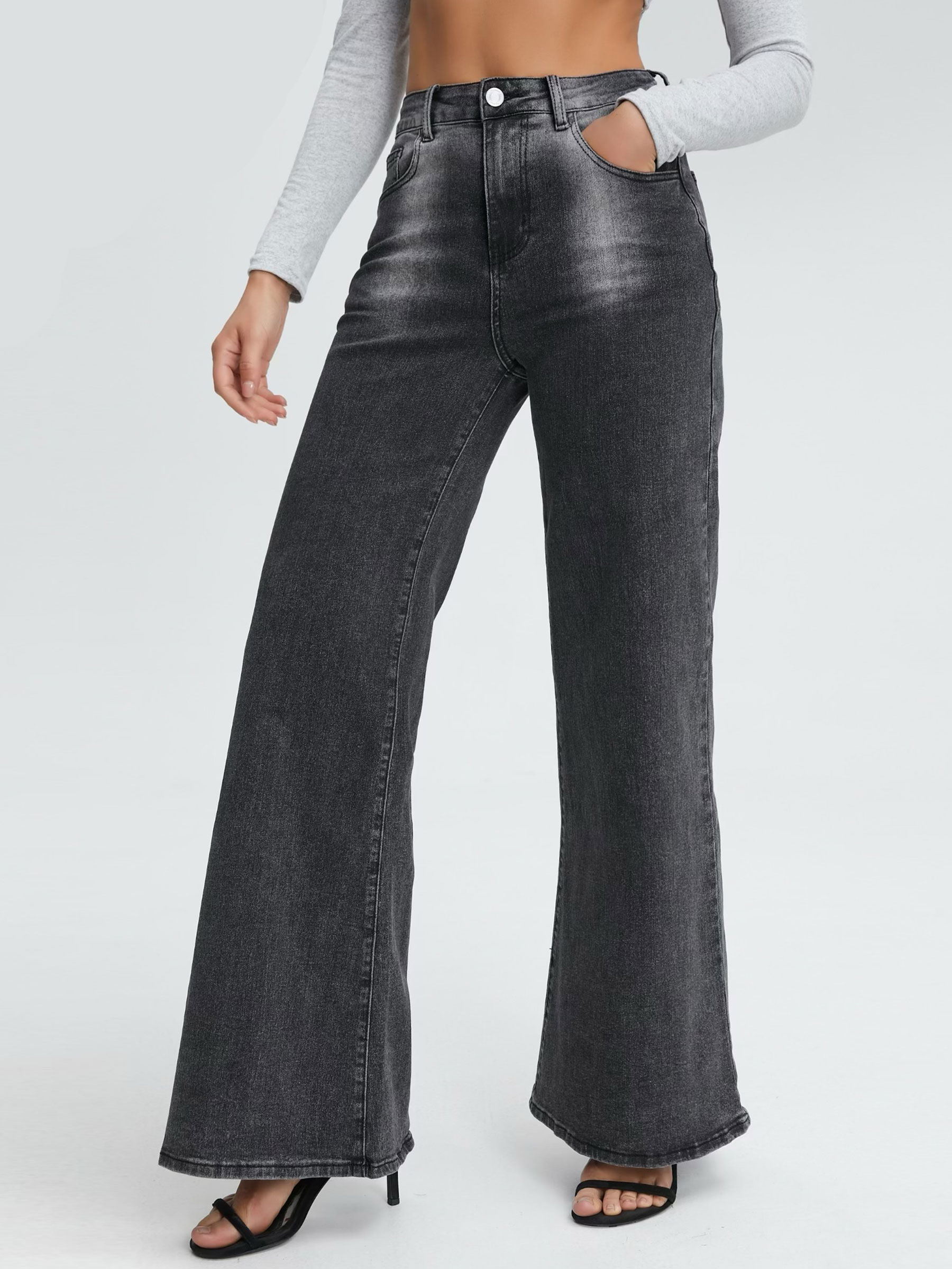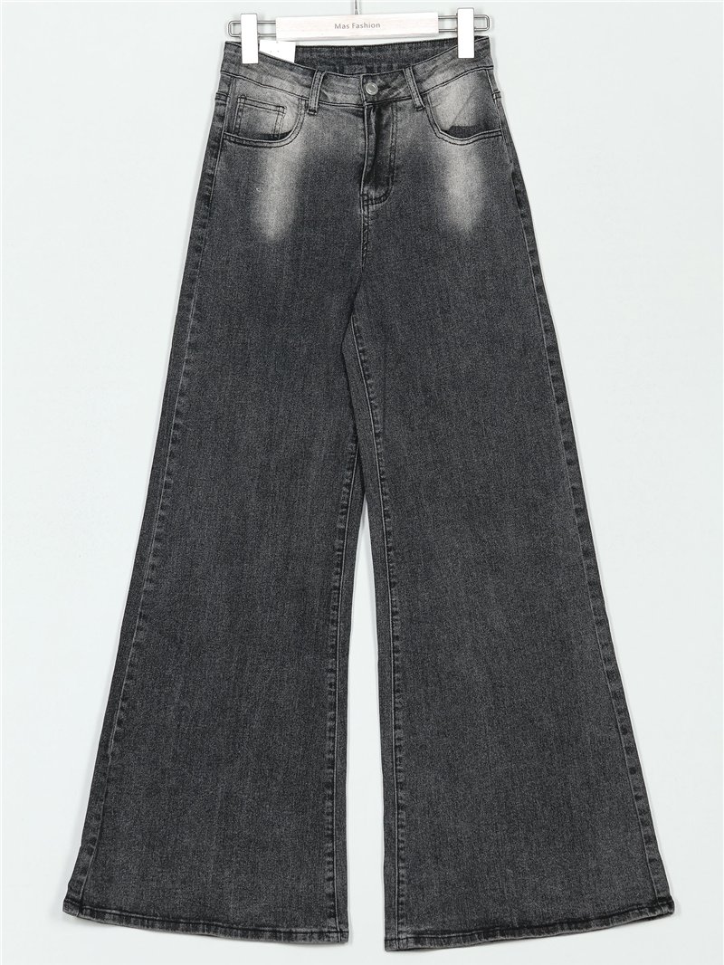 Vaqueros acampanados. Efecto lavado. Tiro alto. Cuatros bolsillos. Cierre frontal con cremallera y botón metálico.