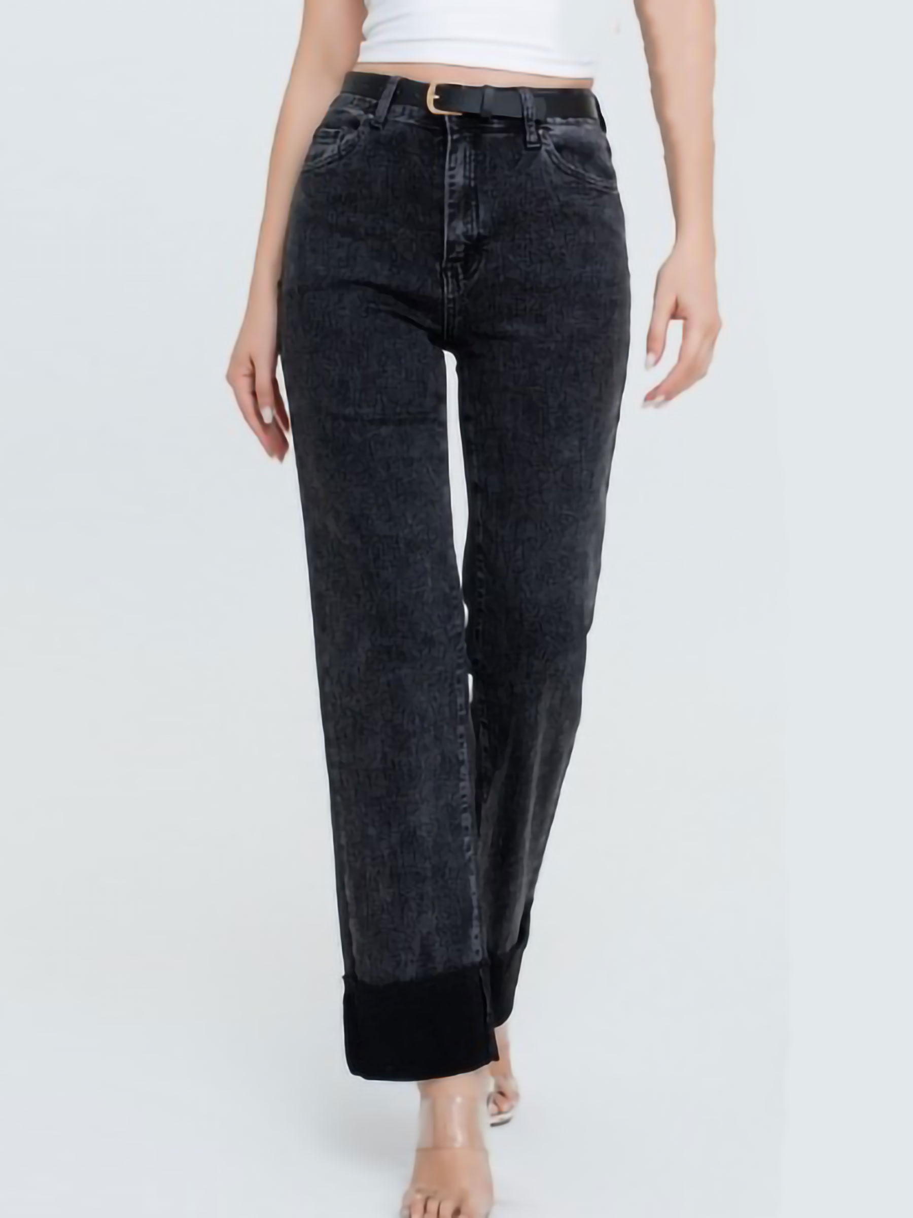Vaqueros tiro alto con cinturón a juego. Bajo acabado deshilachado en vueltas. Cinco bolsillos. Cierre frontal con cremallera y botón metálico.