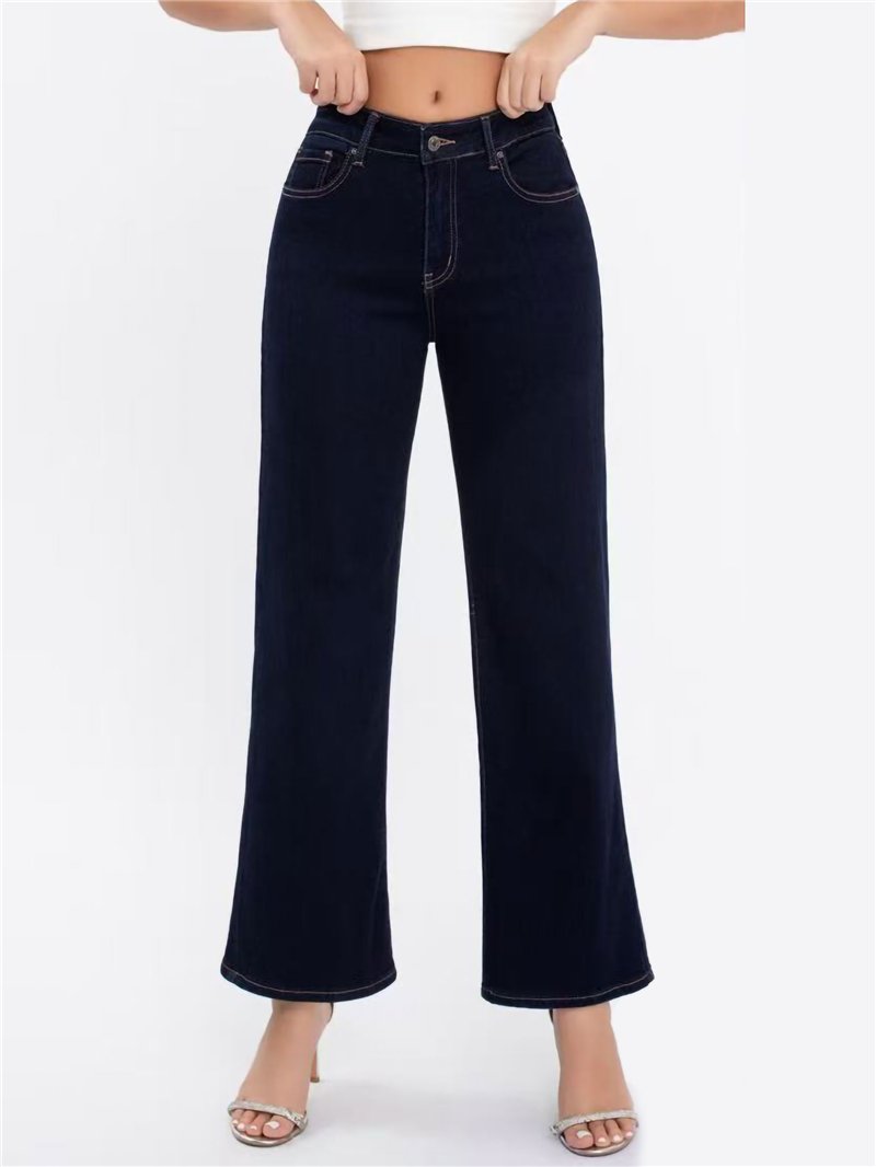Vaqueros rectos con pelo. Tiro alto. Cinco bolsillos. Cierre frontal con cremallera y botón metálico.