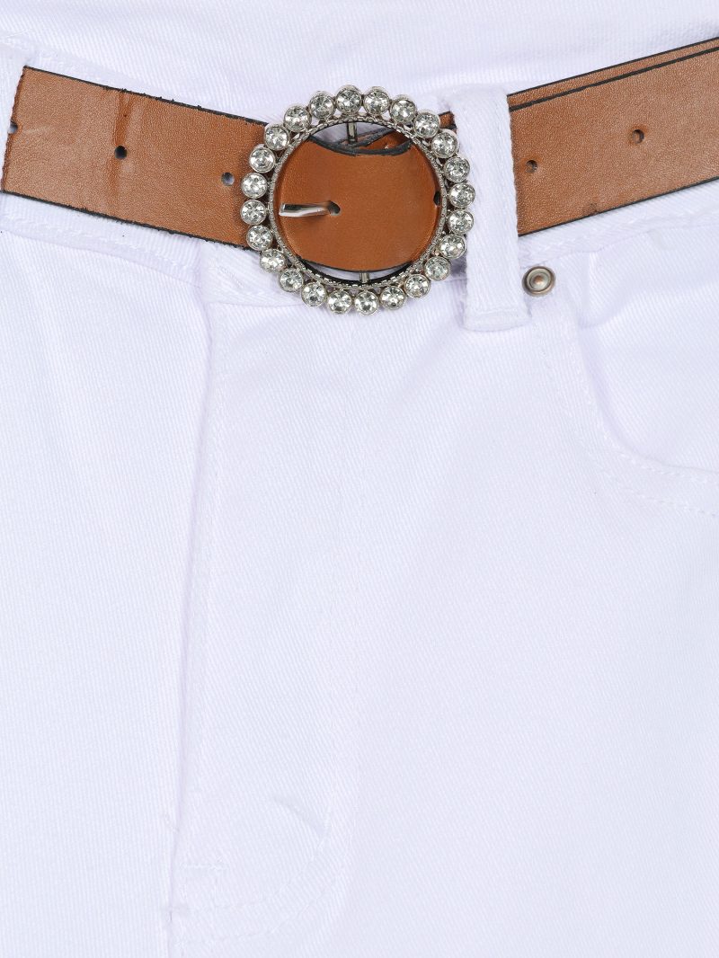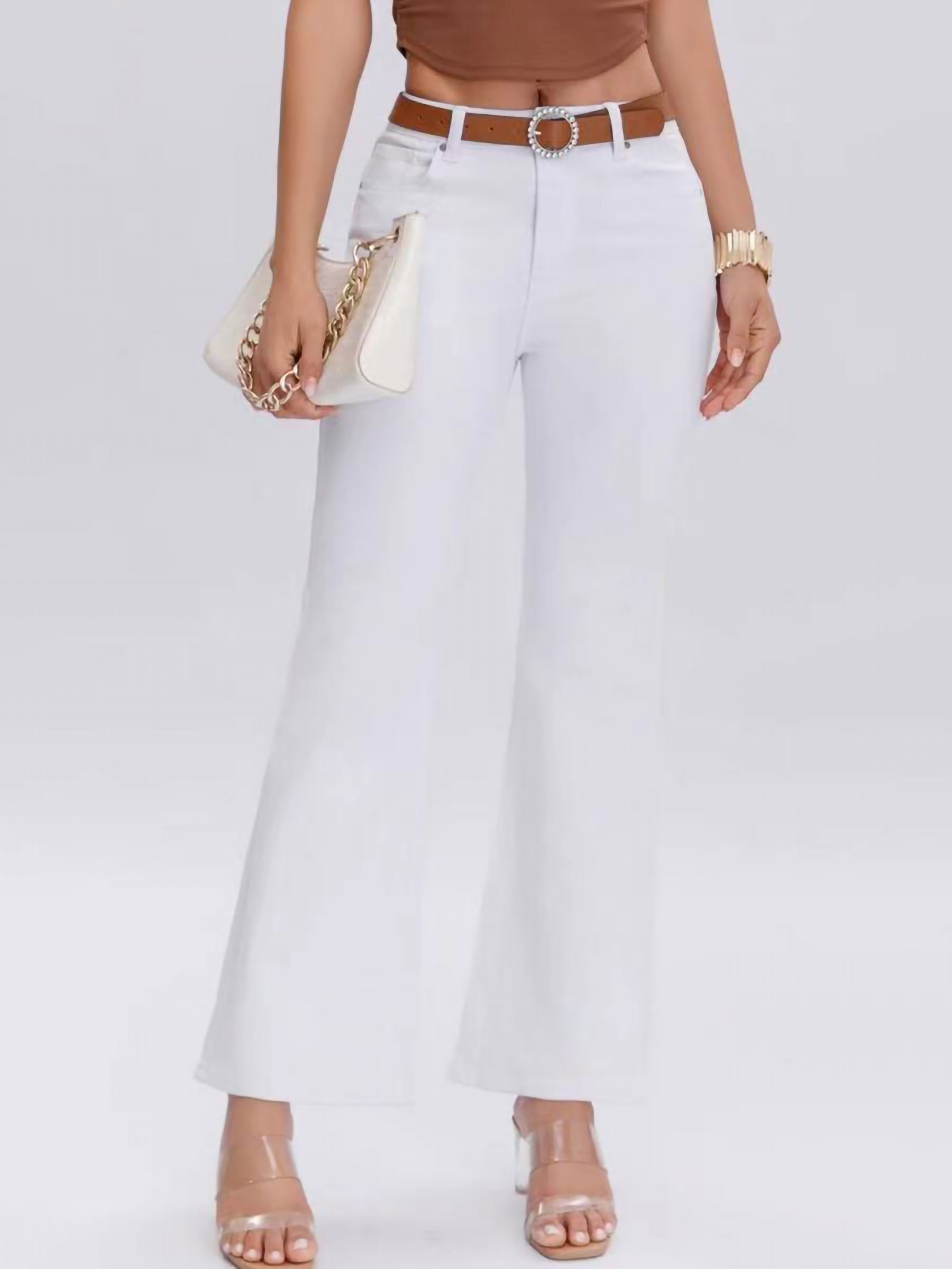 Pantalón vaqueros acampanados. Detalle cinturón a contraste. Push up. Tiro alto. Cincos bolsillos. Cierre frontal con cremallera y botón metálico.