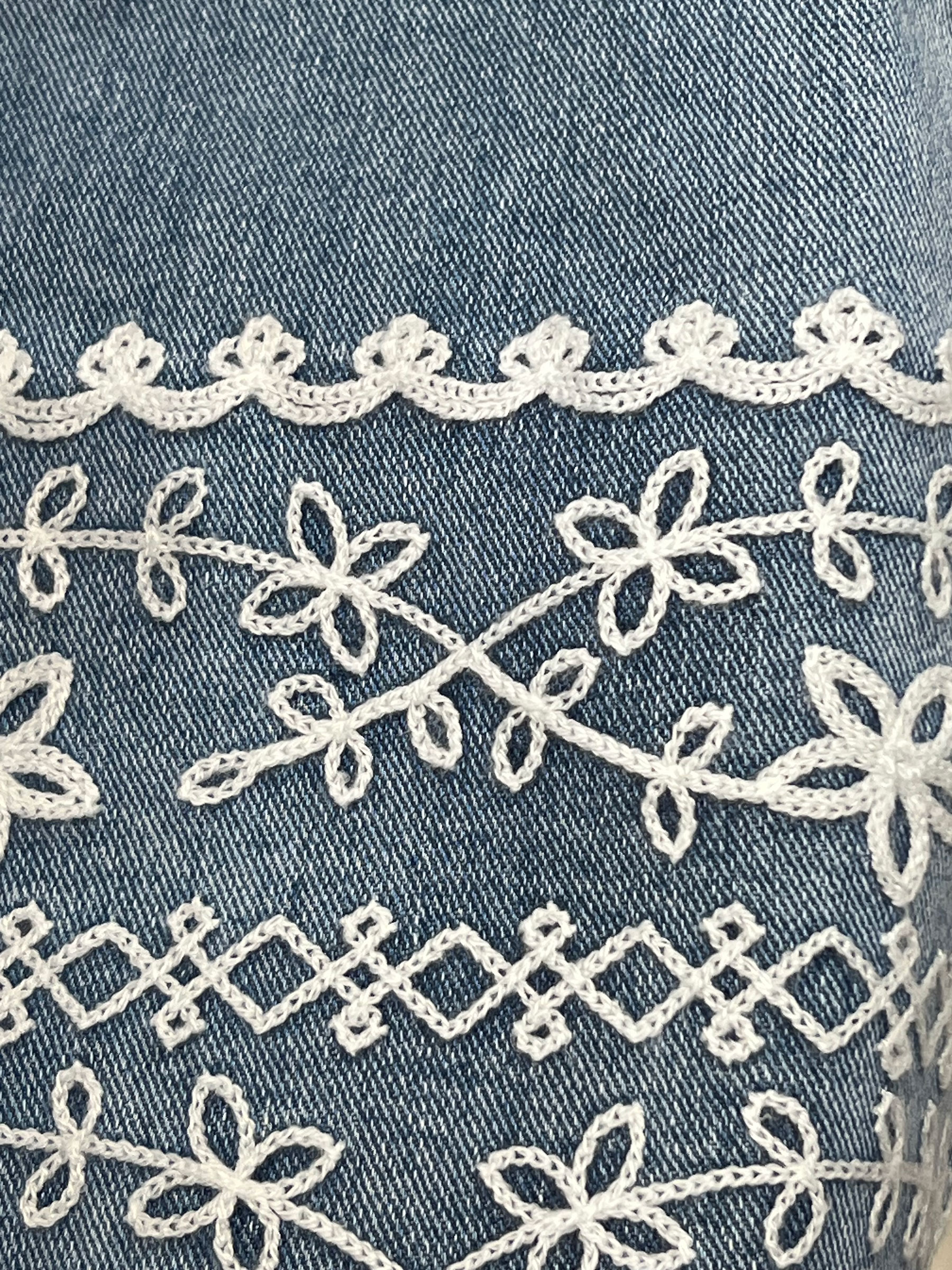 Pantalón vaqueros cropped. Tiro alto. Cinco bolsillos. Bajo bordado y desflecado. Cierre con cremallera y botón. Tiro 26 cm. Largo 88 cm. Bajo 24 cm.