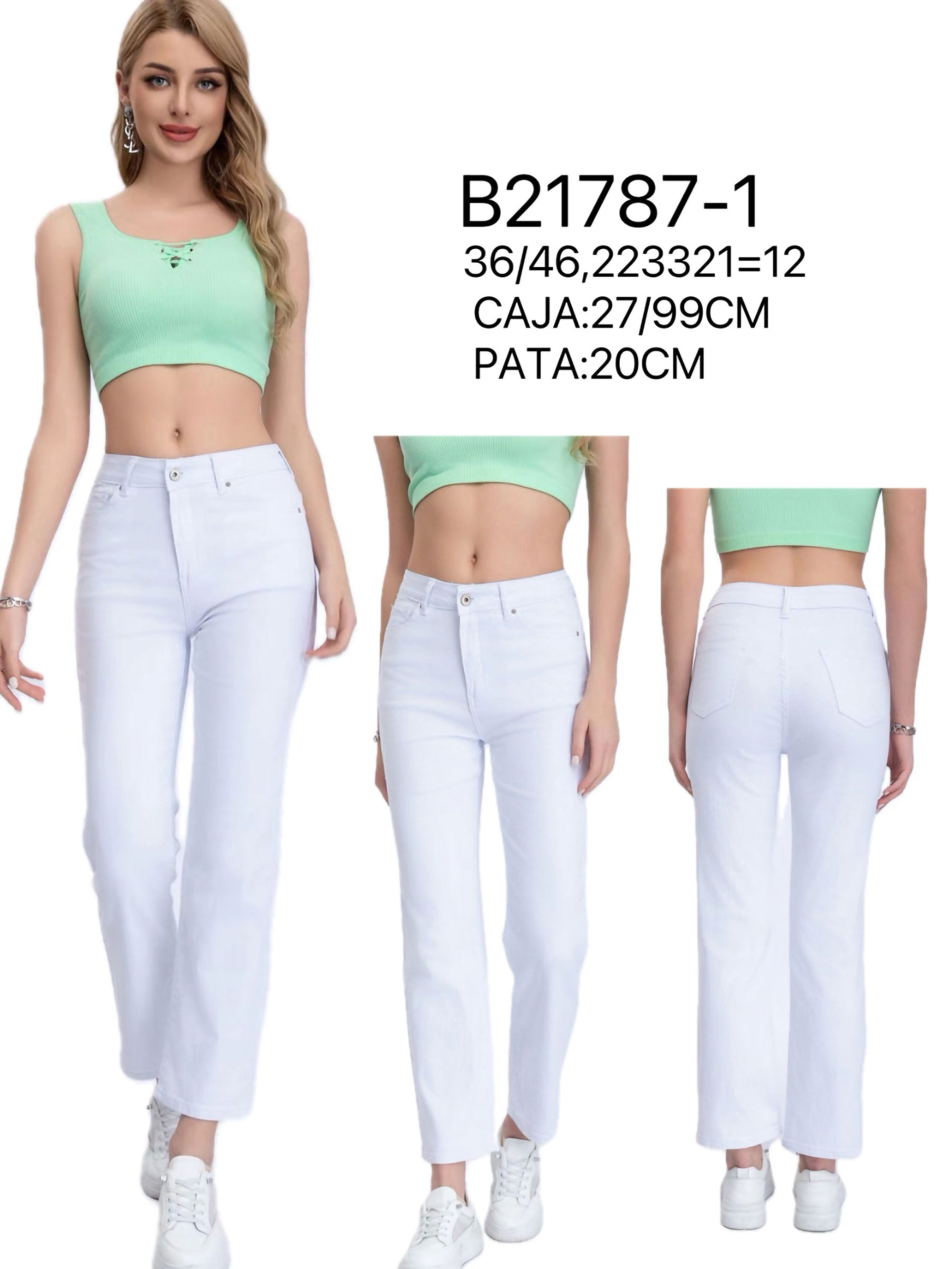 Pantalón vaqueros básico. Tiro alto. Cinco bolsillos. Cierre frontal con cremallera y botón metálico. Tiro 28 cm. Largo 97 cm. Bajo 20 cm.