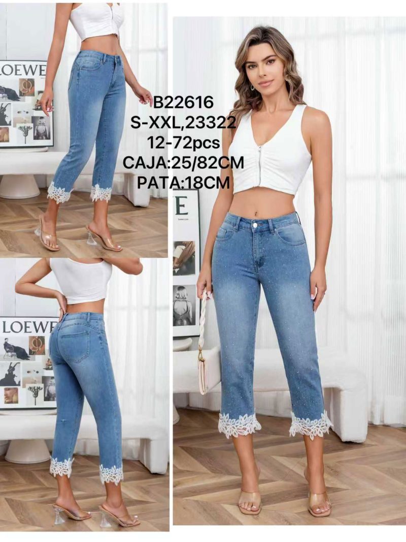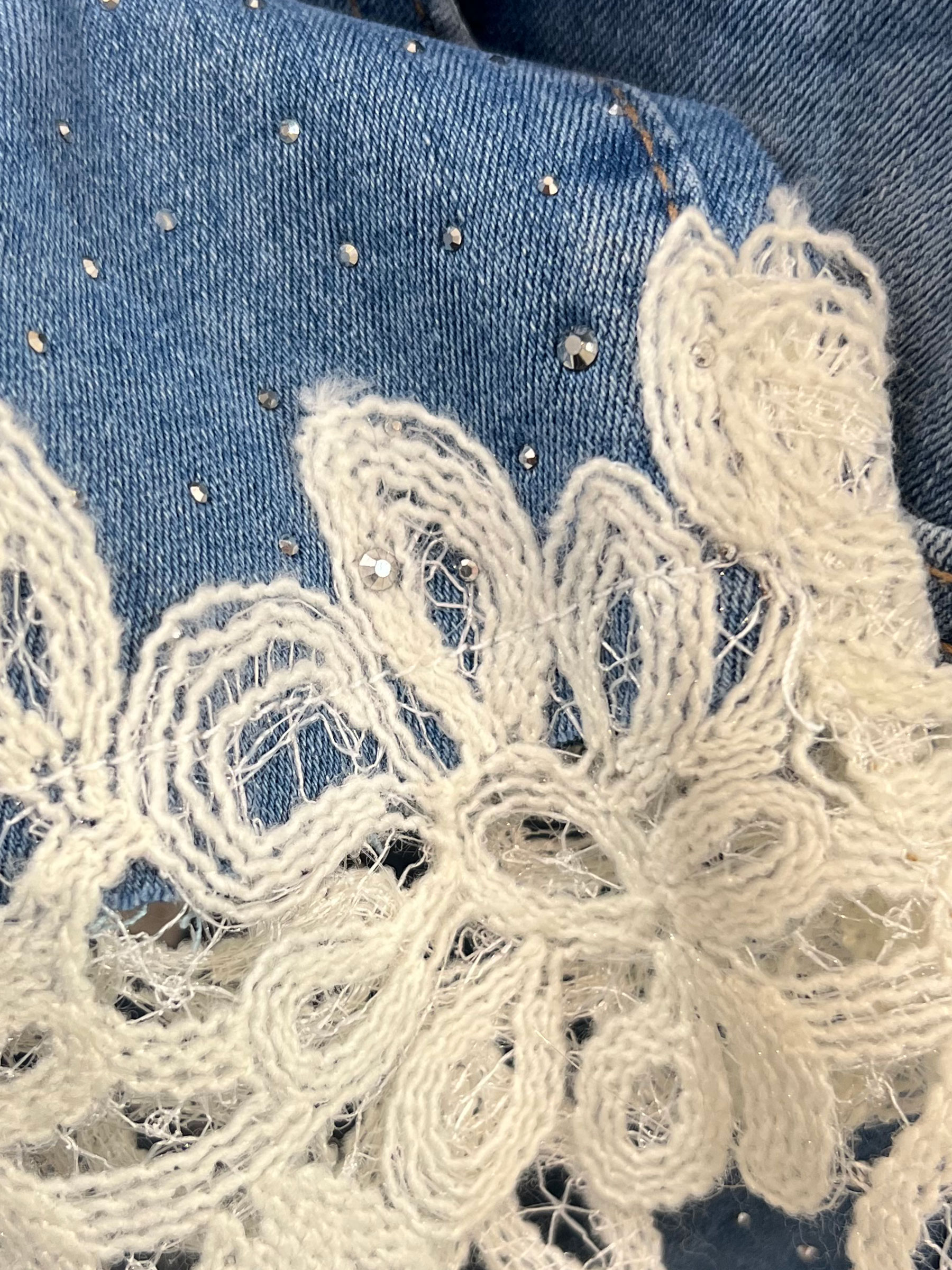 Jeans pirata con strass. Bajo con encaje calado en contraste. Tiro alto. Cinco bolsillos. Cierre frontal con cremallera y botón metálico. Tiro 25 cm. Largo 82 cm. Bajo 18 cm.