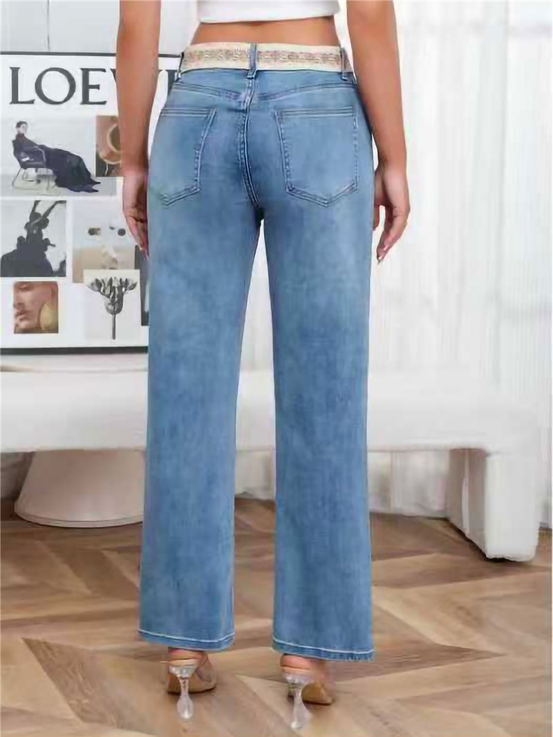Jeans rectos. Cinturón decorativo incluido. Tiro alto. Cinco bolsillos. Cierre frontal con cremallera y botón metálico. Tiro 28 cm. Largo 98 cm. Bajo 20 cm.