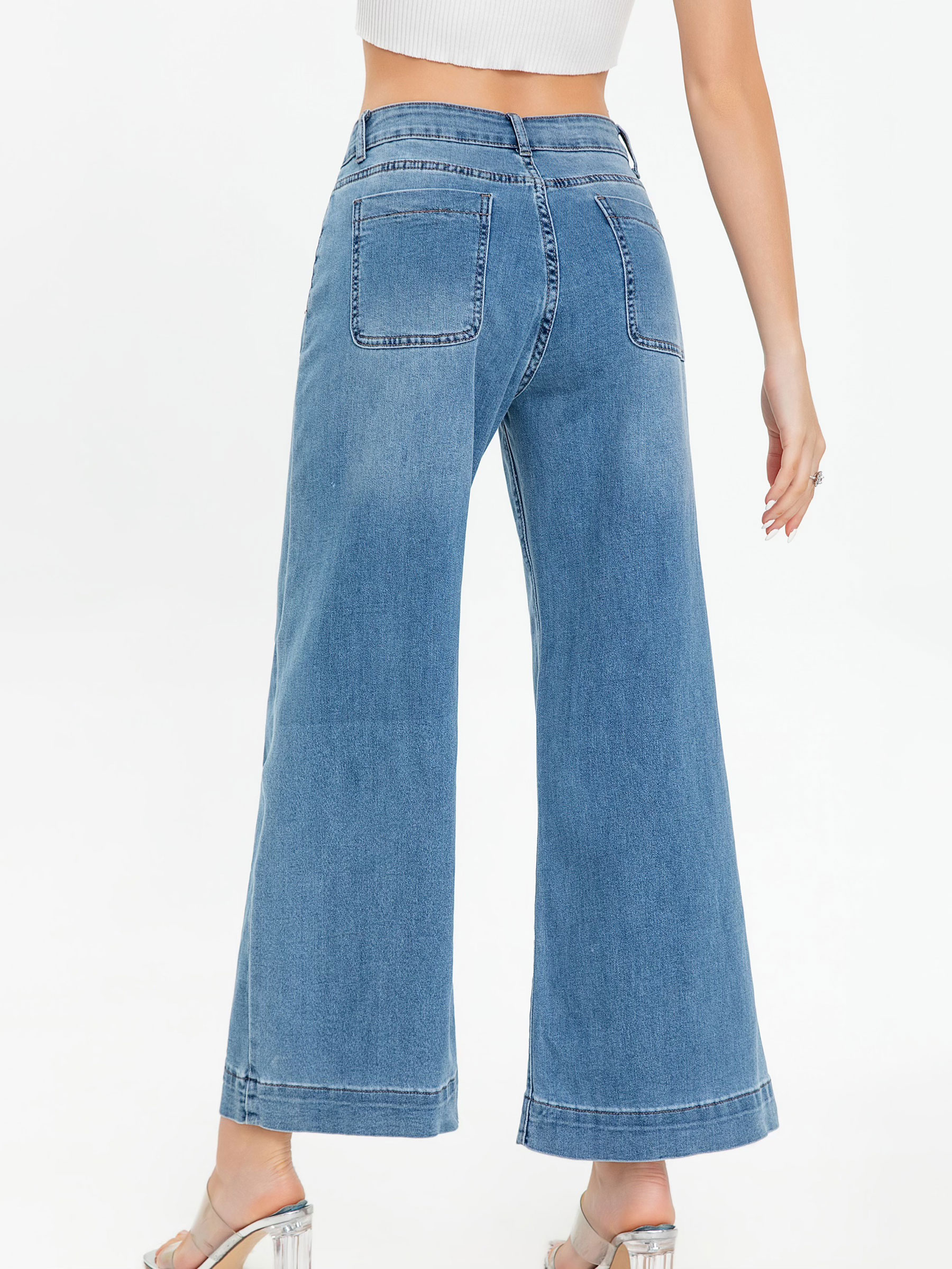 Jeans wide leg. Bolsillos delanteros plastrón. Tiro alto. Bolsillos traseros. Cierre frontal con cremallera y botón metálico. Tiro 27 cm. Largo 99 cm. Bajo 30 cm.