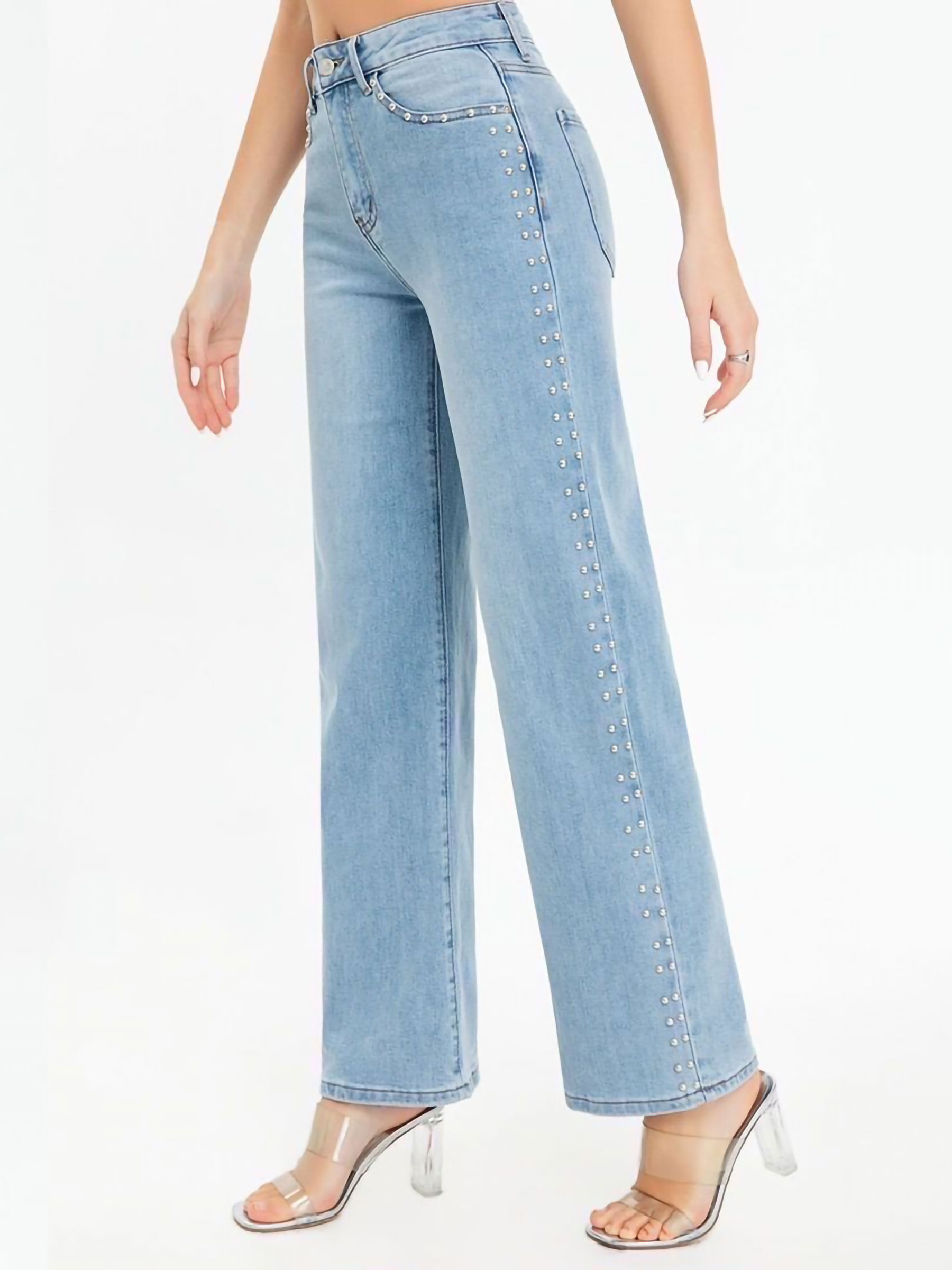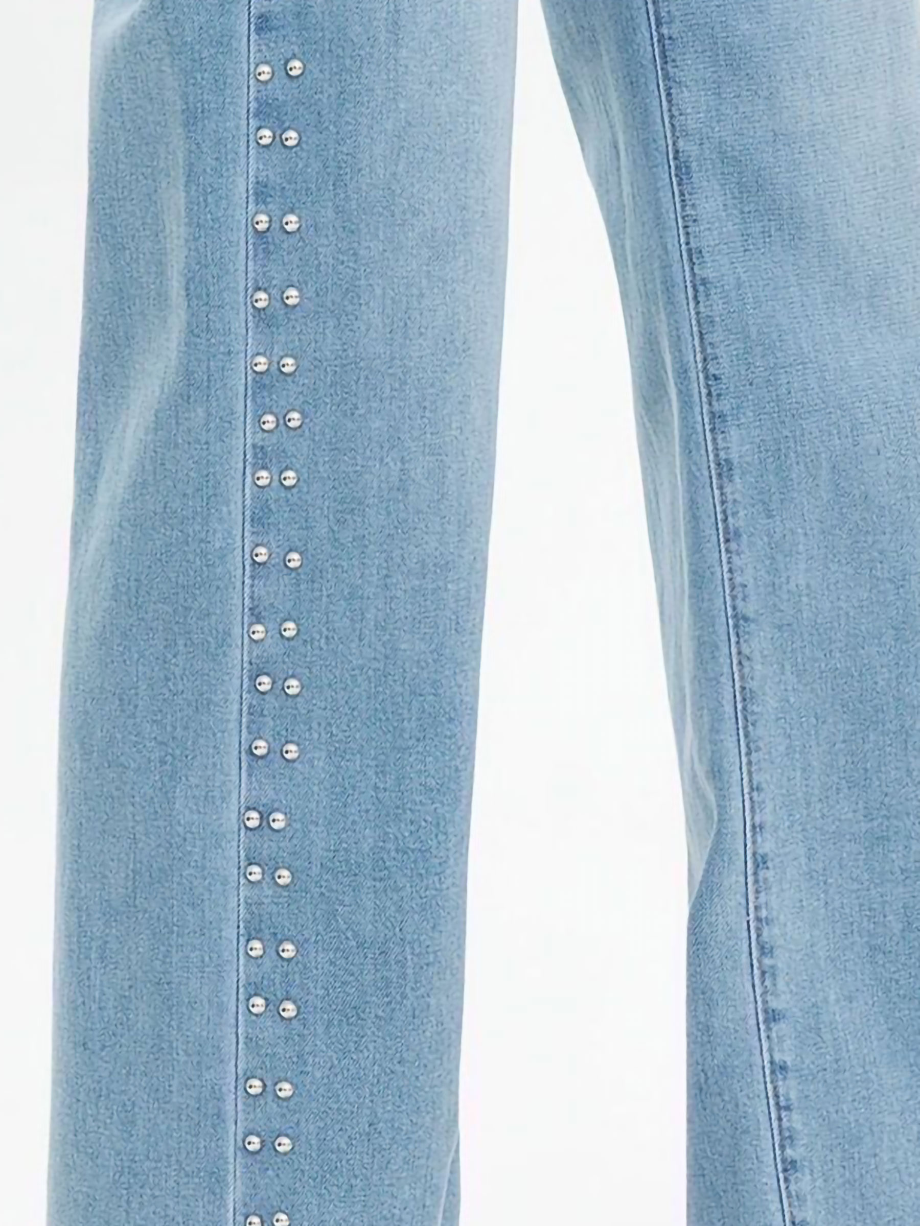Jeans wide leg. Detalle tachas en laterales y bolsillos. Tiro alto. Cinco bolsillos. Cierre frontal con cremallera y botón metálico. Tiro 27 cm. Largo 104 cm. Bajo 26 cm.