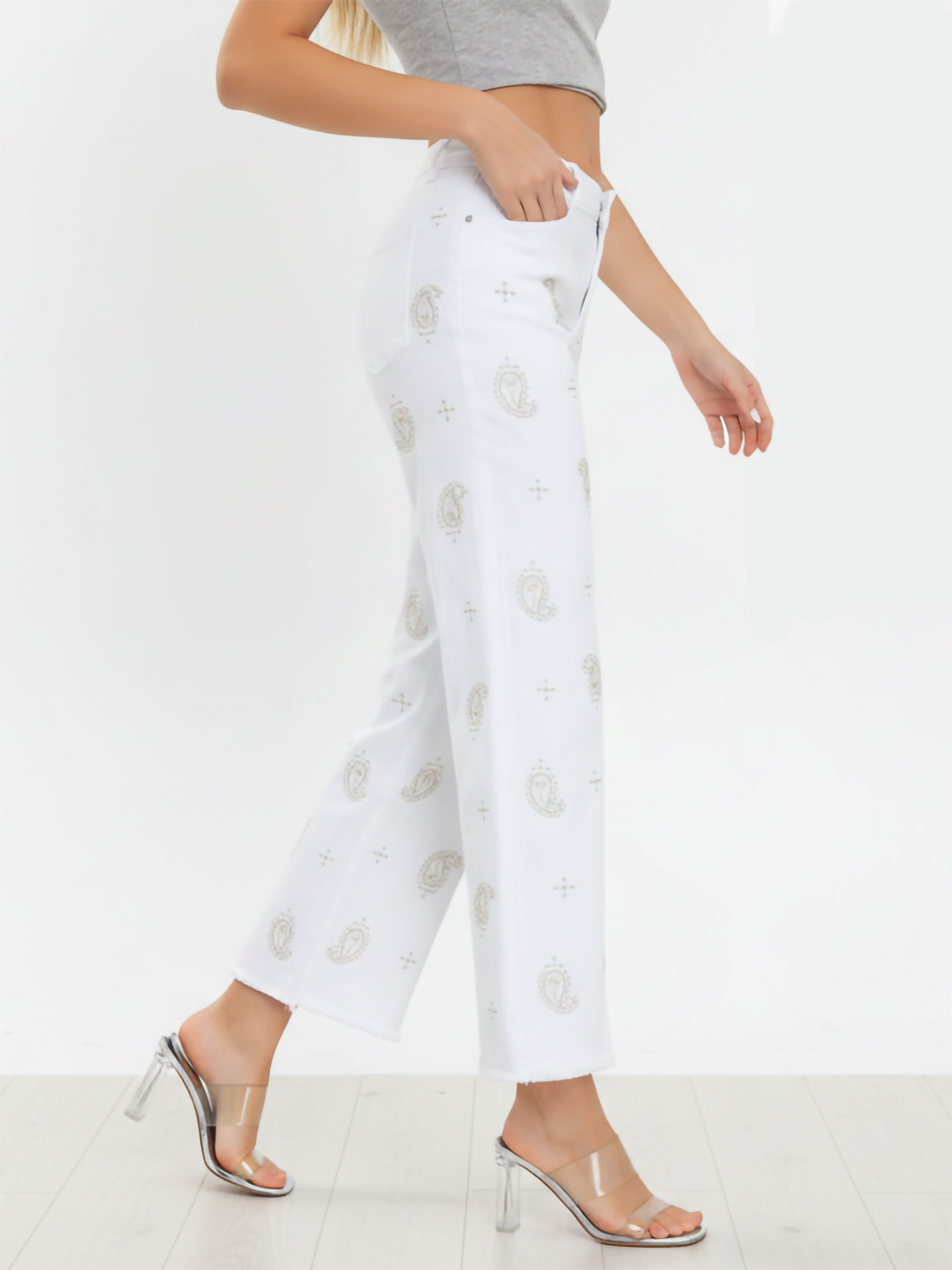 Jeans rectos blancos. Bordado cachemir en contraste. Tiro alto. Cinco bolsillos. Cierre frontal con cremallera y botón metálico. Tiro 26 cm. Largo 97 cm. Bajo 23 cm.