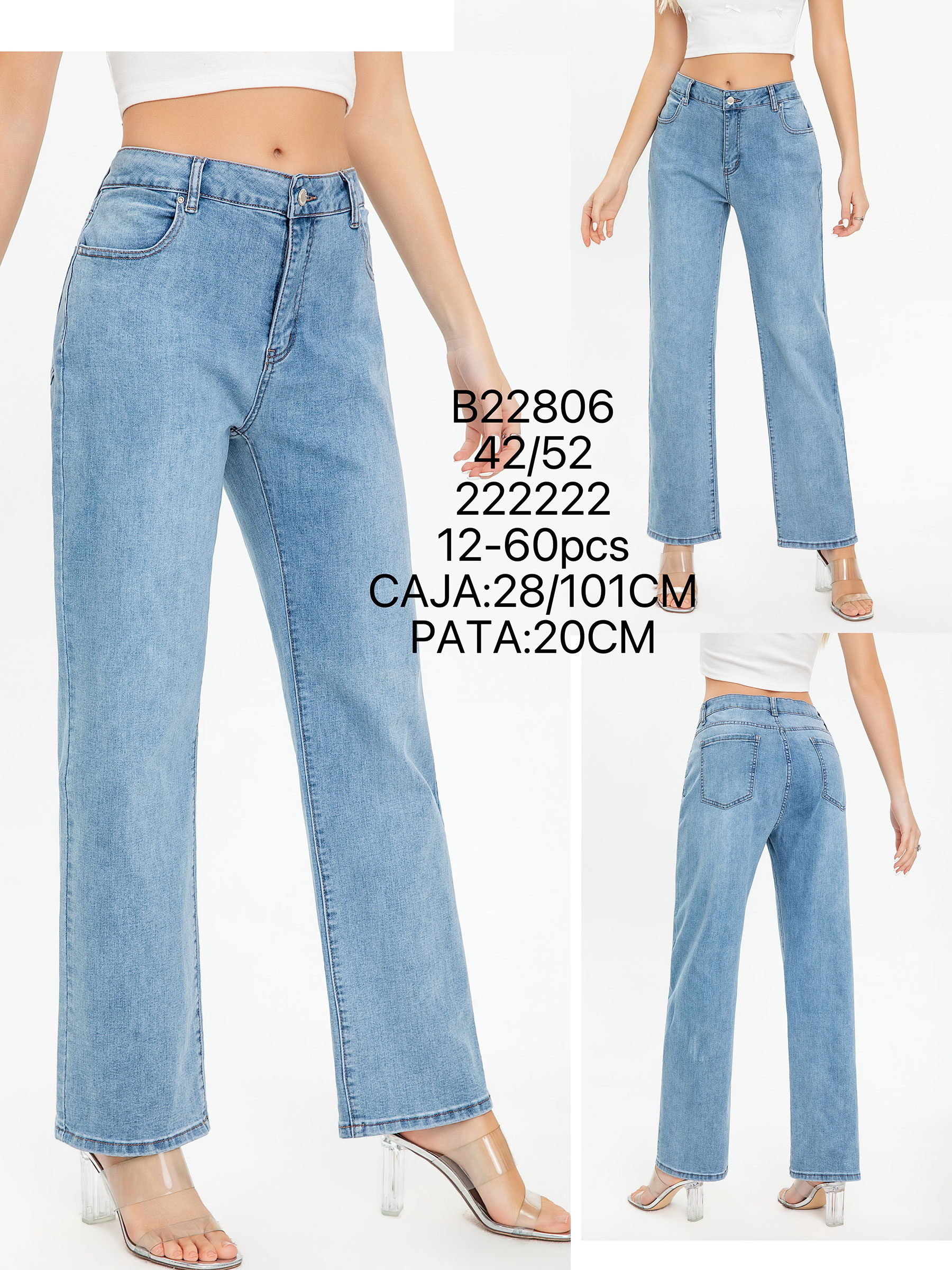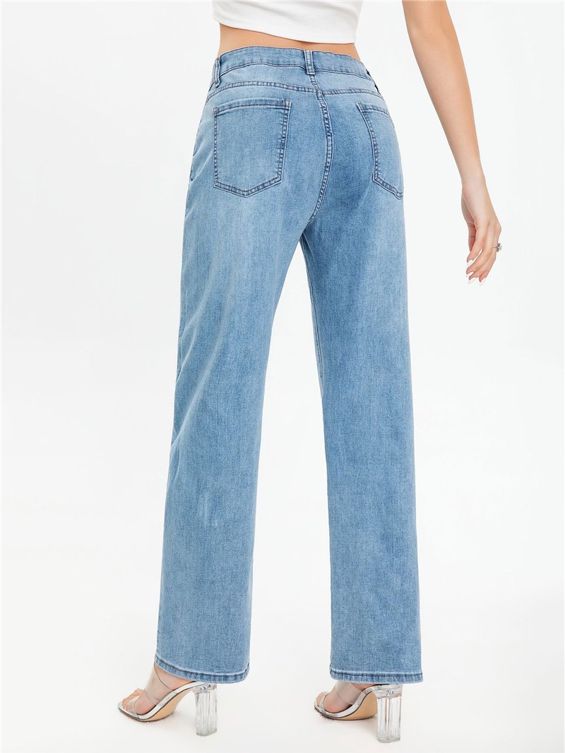 Jeans rectos. Diseño liso. Tiro alto. Cinco bolsillos. Cierre frontal con cremallera y botón metálico. Tiro 28 cm. Largo 101 cm. Bajo 20 cm.