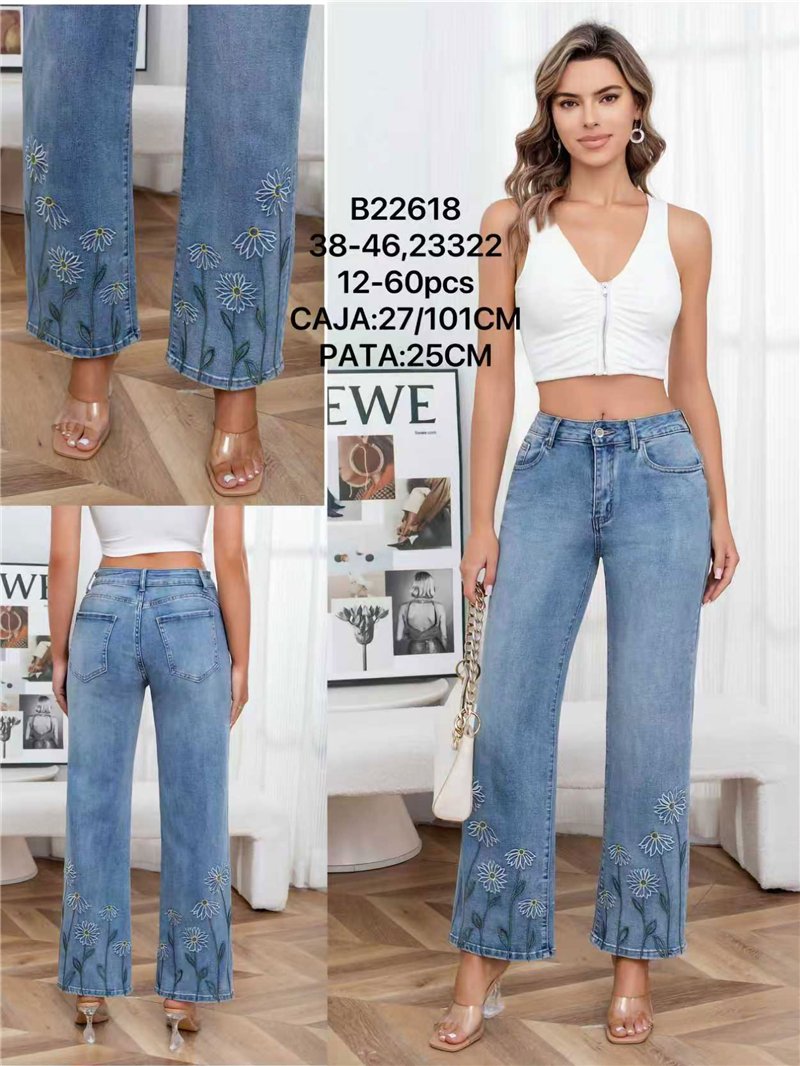 Jeans rectos. Bordado de margaritas en el bajo. Tiro alto. Cinco bolsillos. Cierre frontal con cremallera y botón metálico. Tiro 27 cm. Largo 101 cm. Bajo 25 cm.